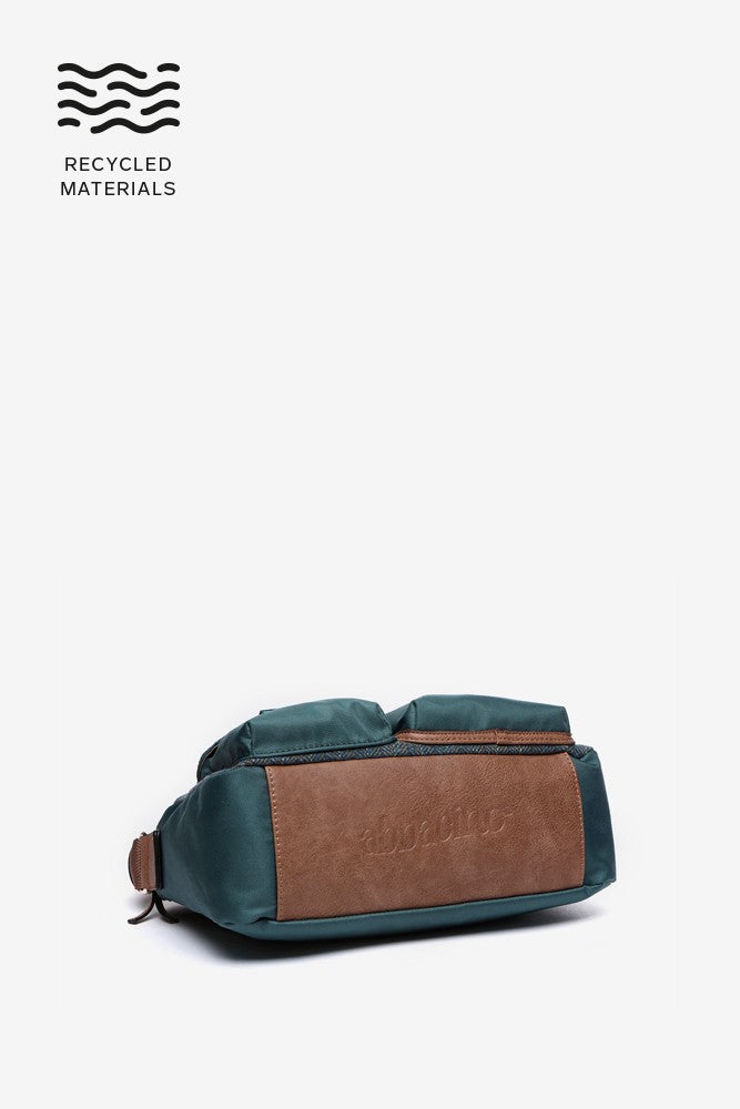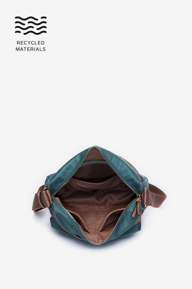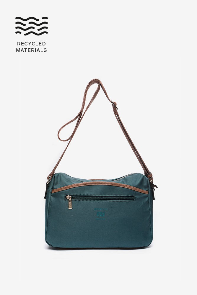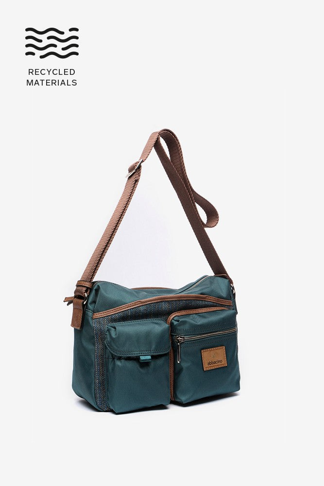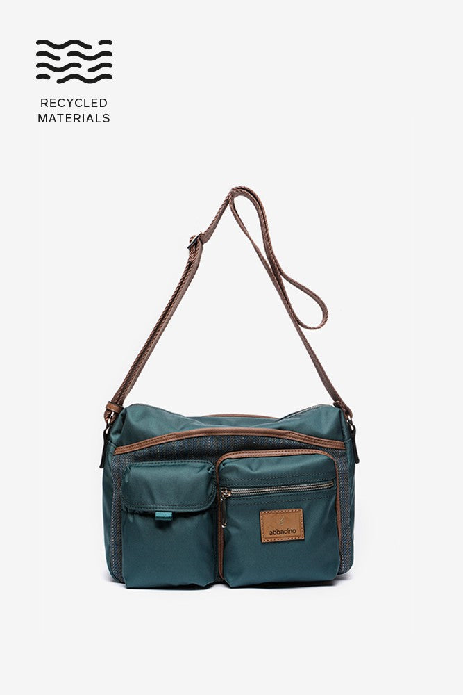 Bandolera de mujer multi bolsillos elaborada en materiales reciclados, que combina dos diferentes texturas de tejido. Un diseño muy funcional gracias a los diversos compartimentos interiores y exteriores de los que dispone, que te permitirán organizar y tener siempre a mano tus objetos esenciales para el día a día.