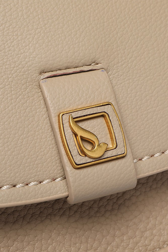• Cierre frontal con solapa y un aplique metálico con el lotipo de la marca.