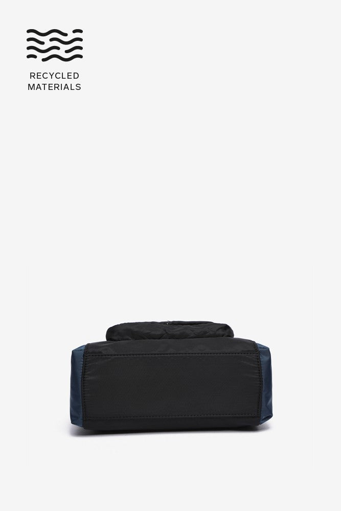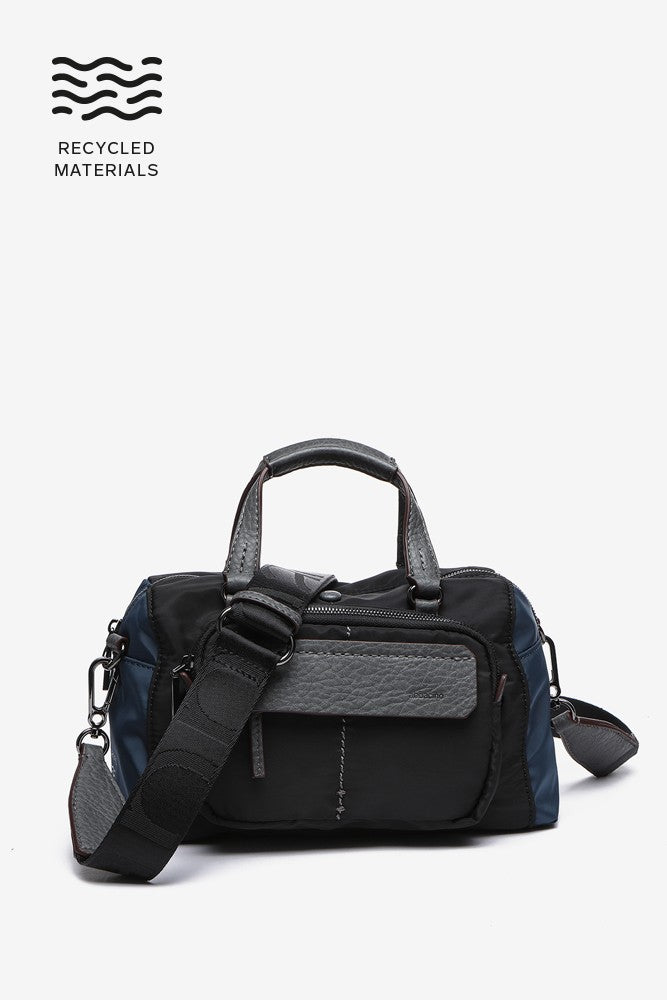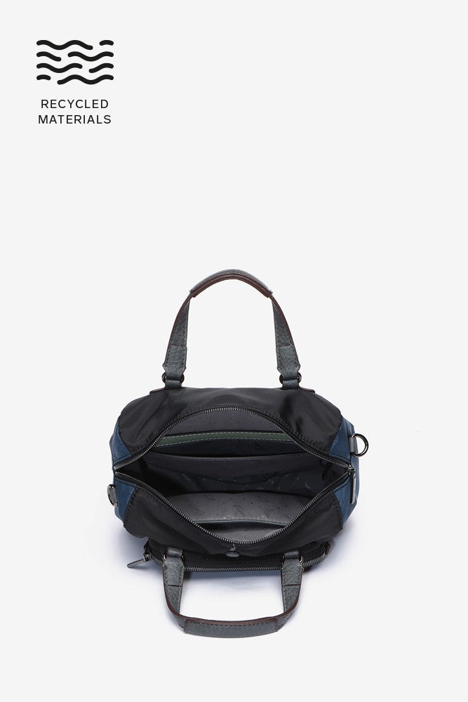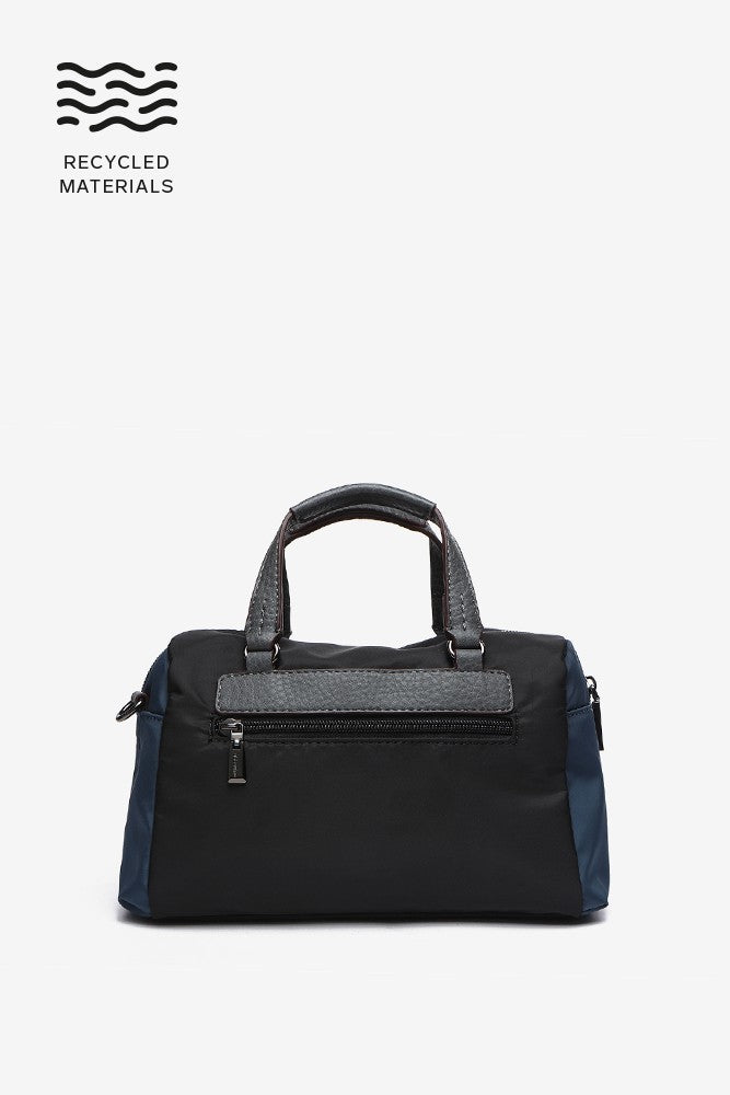 Bolso bowling de mujer elaborado en materiales reciclados, que combina diferentes texturas y despunta por su original combinación de tonos, todos ellos en perfecta harmonía.