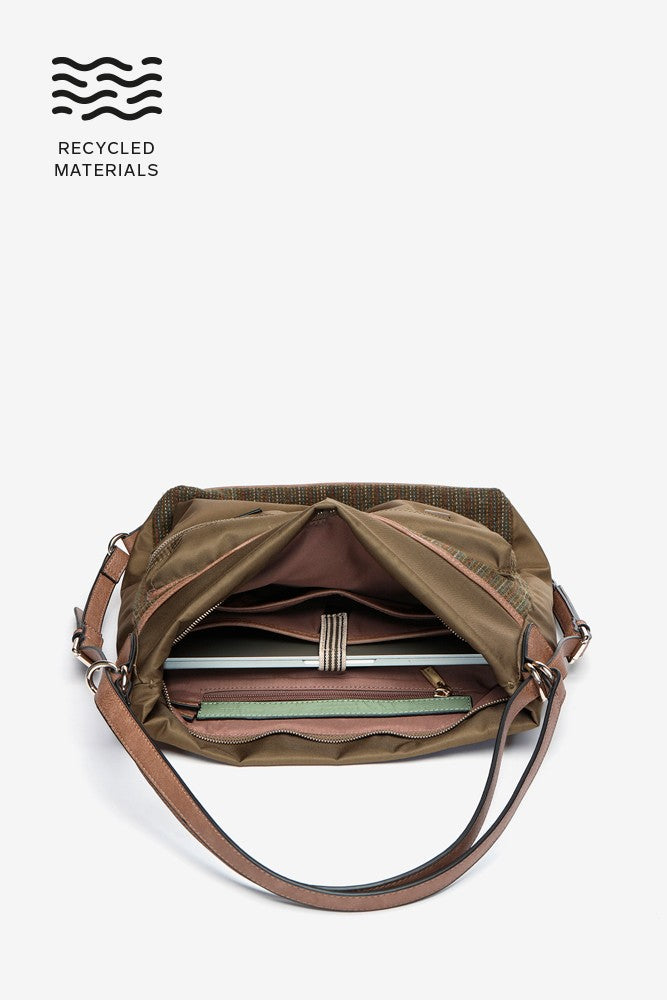 Bolso convertible en mochila para el portátil multi bolsillos elaborado en materiales reciclados, que combina dos diferentes texturas de tejido. Un diseño muy funcional gracias a los diversos compartimentos interiores y exteriores de los que dispone, que te permitirán organizar y tener siempre a mano tus objetos esenciales para el día a día.