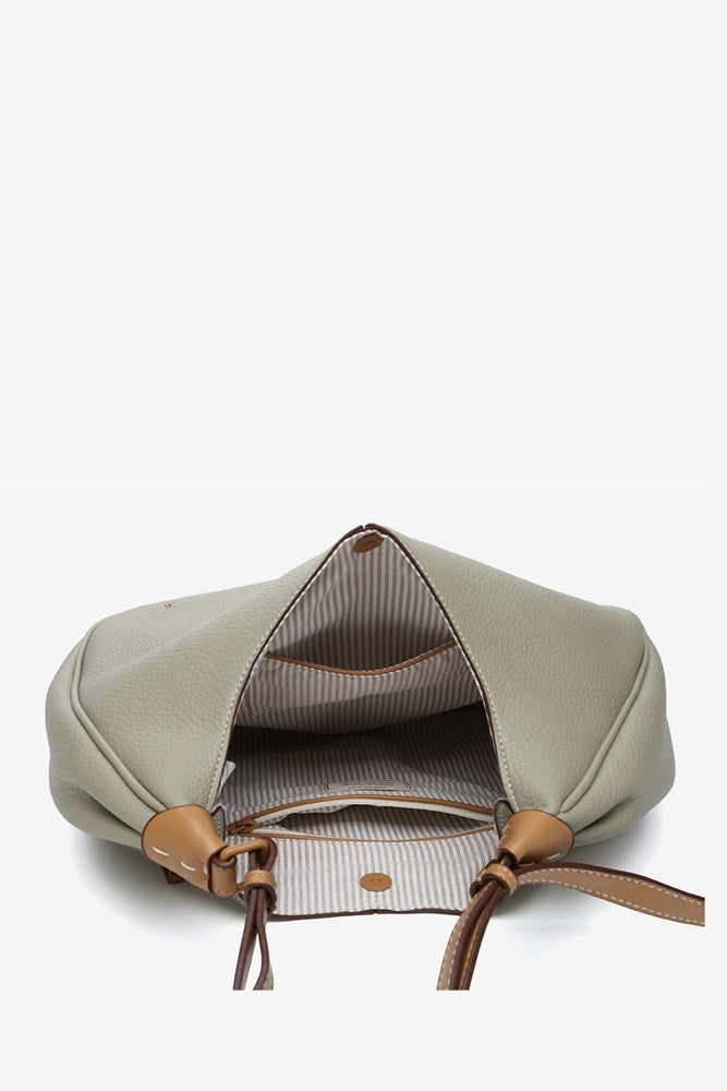 Maxi bolso de hombro estilo hobo elaborado en materiales reciclados. Sencillo y minimalista dispone de una amplia capacidad interior, perfecto para acompañarte a la oficina. Dispone de detalles en color cuero. Sus principales características son:
