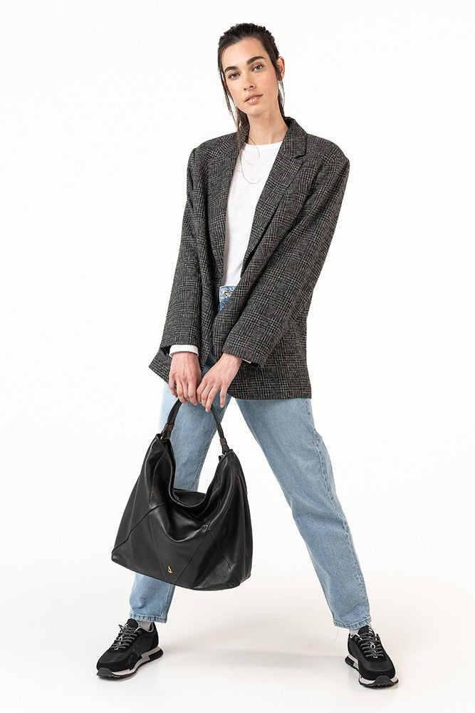 Bolso de hombro estilo hobo elaborado con piel Premium. Amplio y fluido dispone de una gran capacidad interior que te permitirá llevar todo lo que necesites en tu día a día. En su exterior, destaca el motivo geométrico que surge de la superposición de los patrones de piel. Sus principales características son: