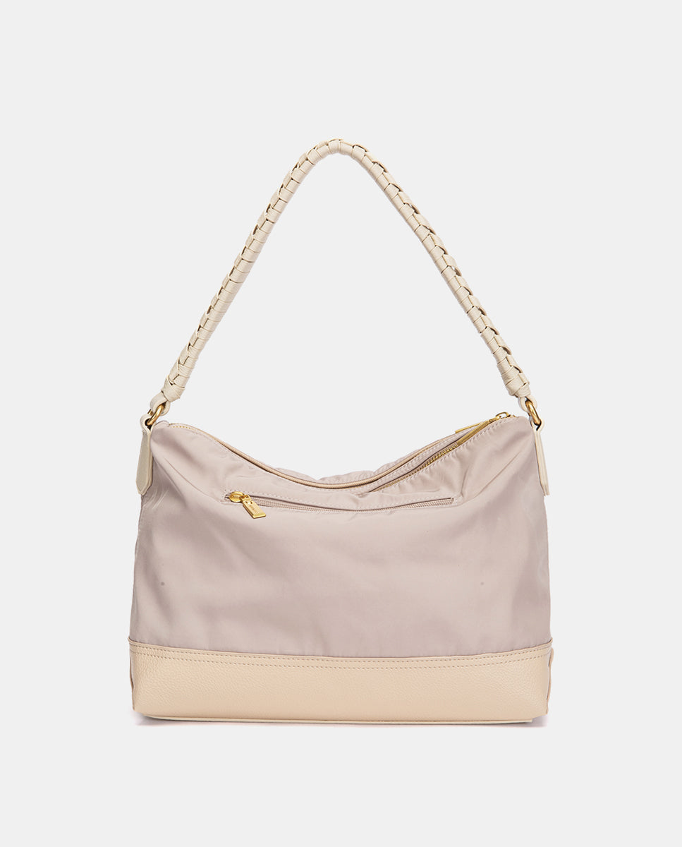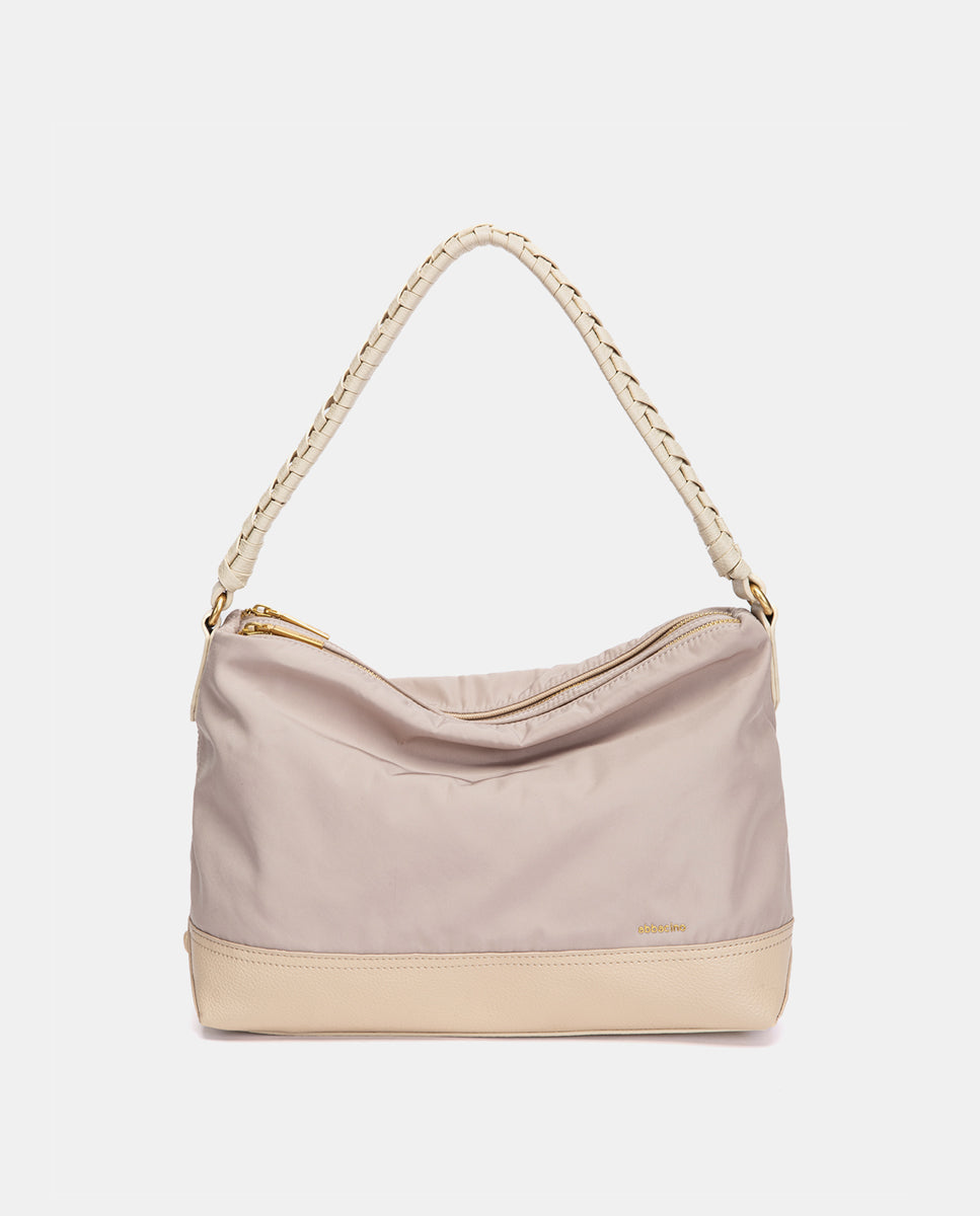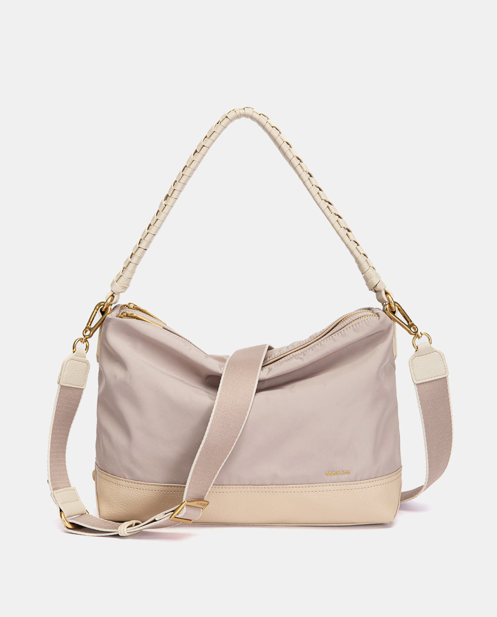 • Asa de hombro cómoda con detalle trenzado, combinada con bandolera textil de quita y pon.