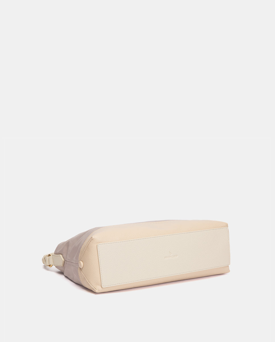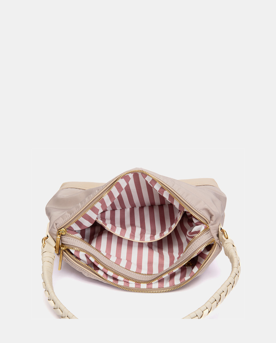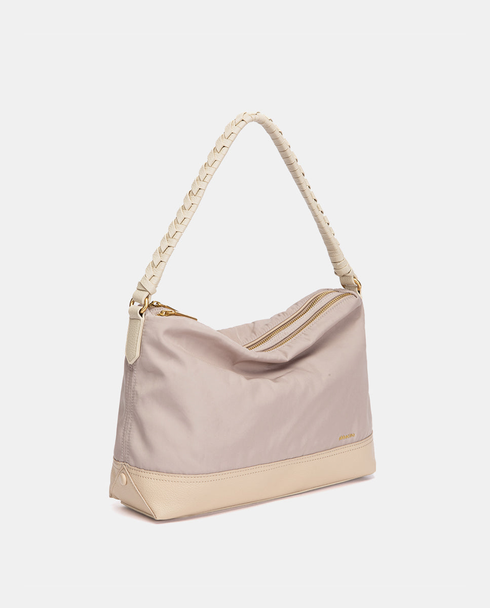 • Asa de hombro cómoda con detalle trenzado, combinada con bandolera textil de quita y pon.