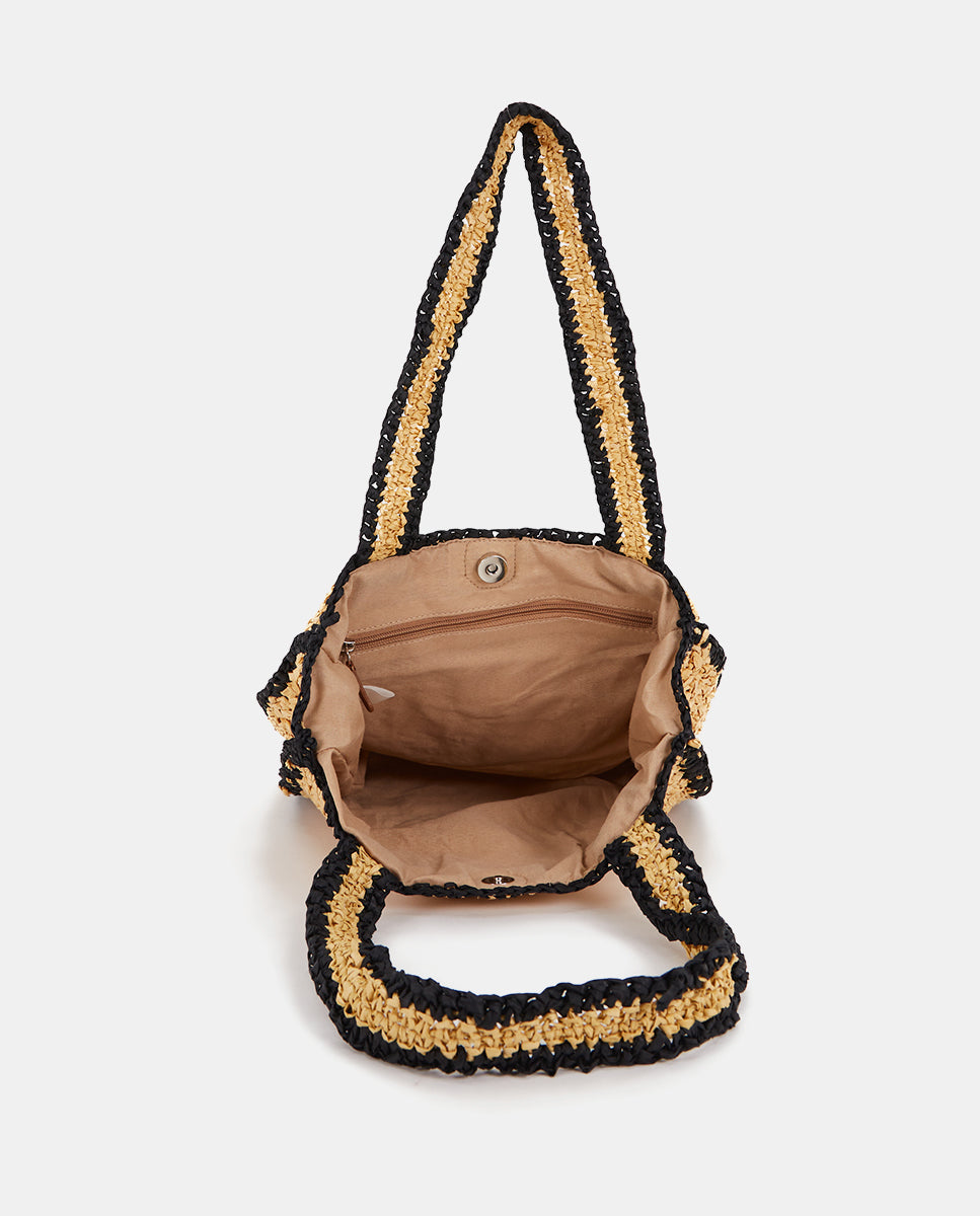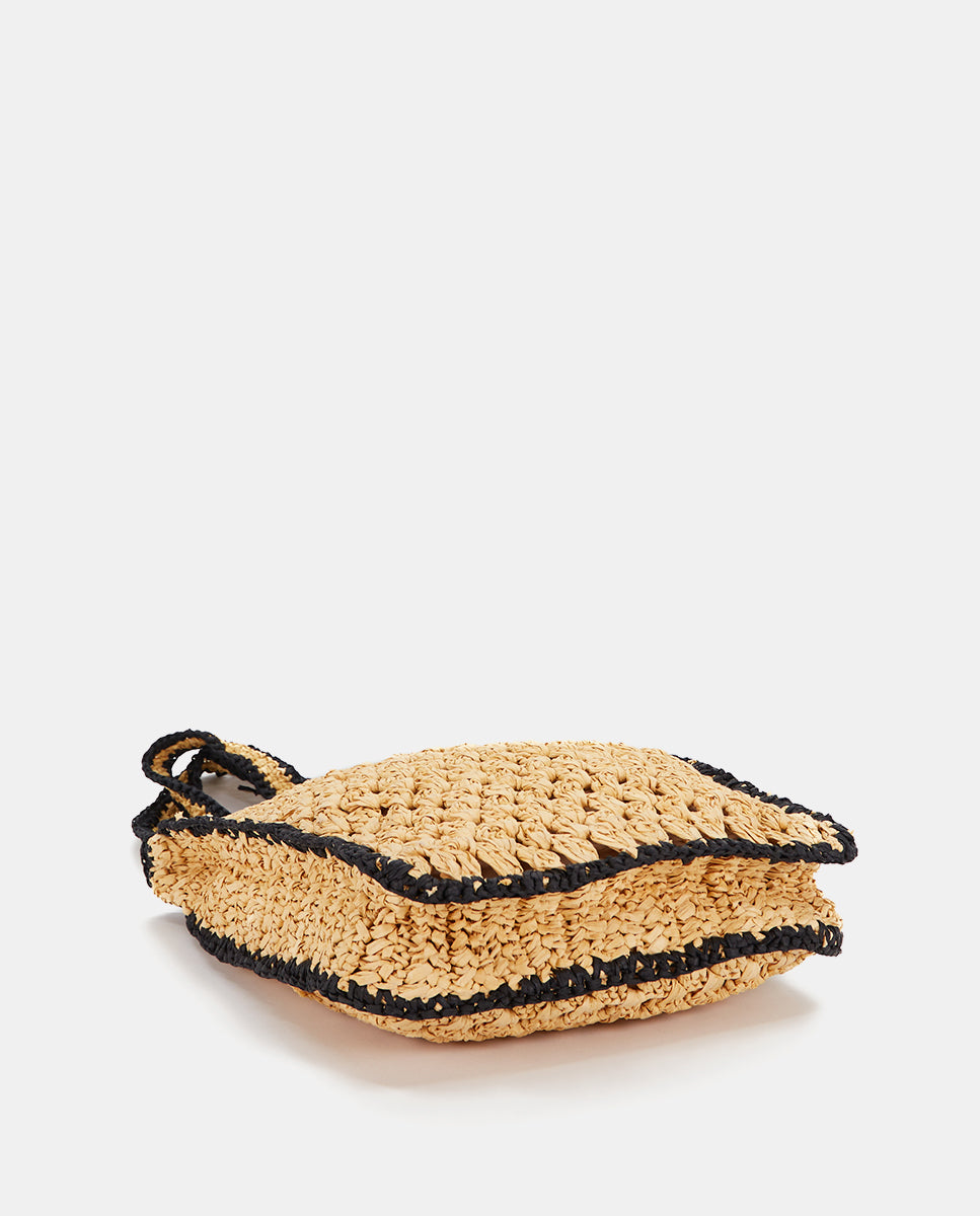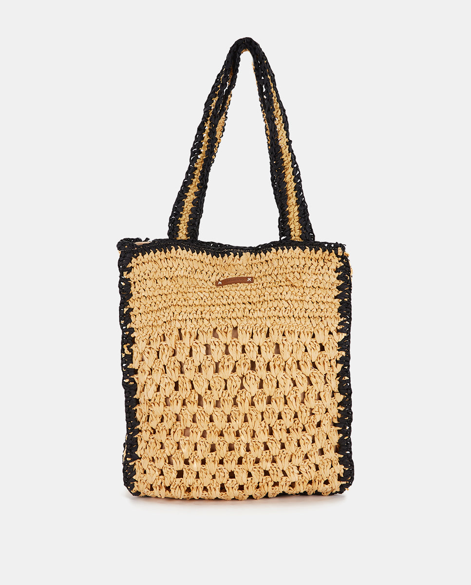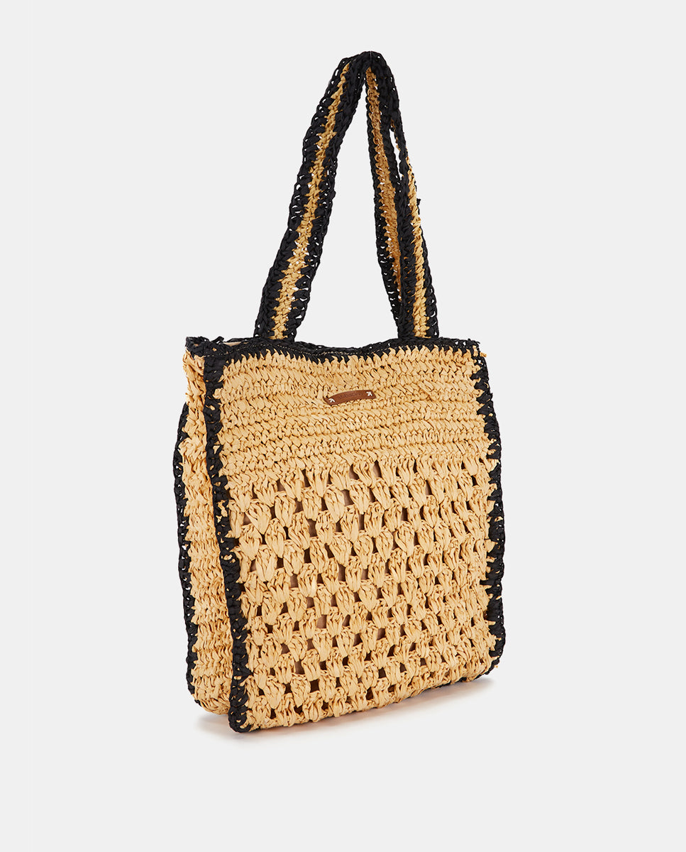 Bolso de hombro de mujer elaborado en fibras naturales trenzadas con detalles en contraste en color negro. Un diseño perfecto para combinar con tus looks más veraniegos. Sus principales características son: