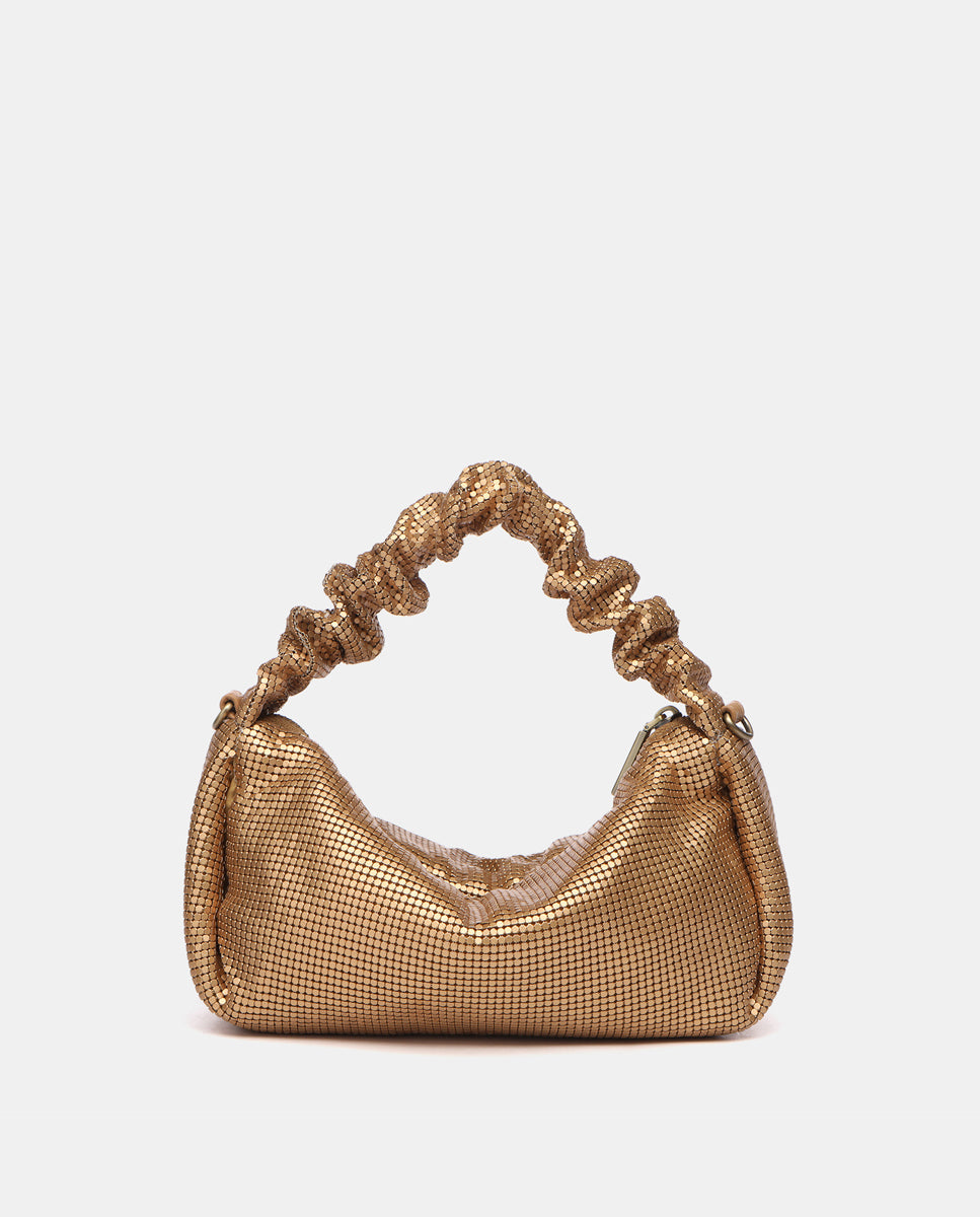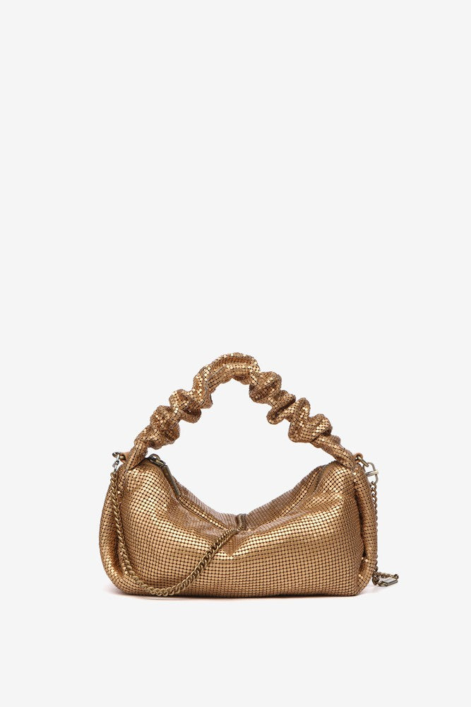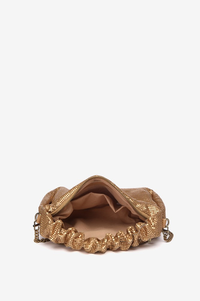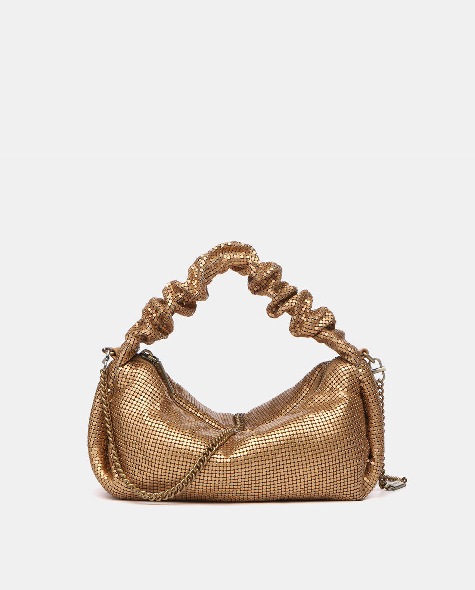 Bolso de mano de fiesta de mujer en forma de media luna elaborado en malla metálica. Un diseño que se viste en los colores de temporada con el que brillarás allá donde vayas, perfecto para la noche y el día, es la opción ideal para crear looks únicos. Sus principales características son: