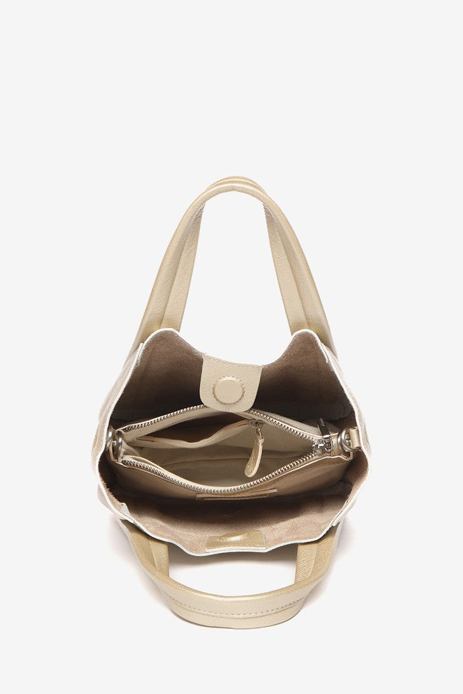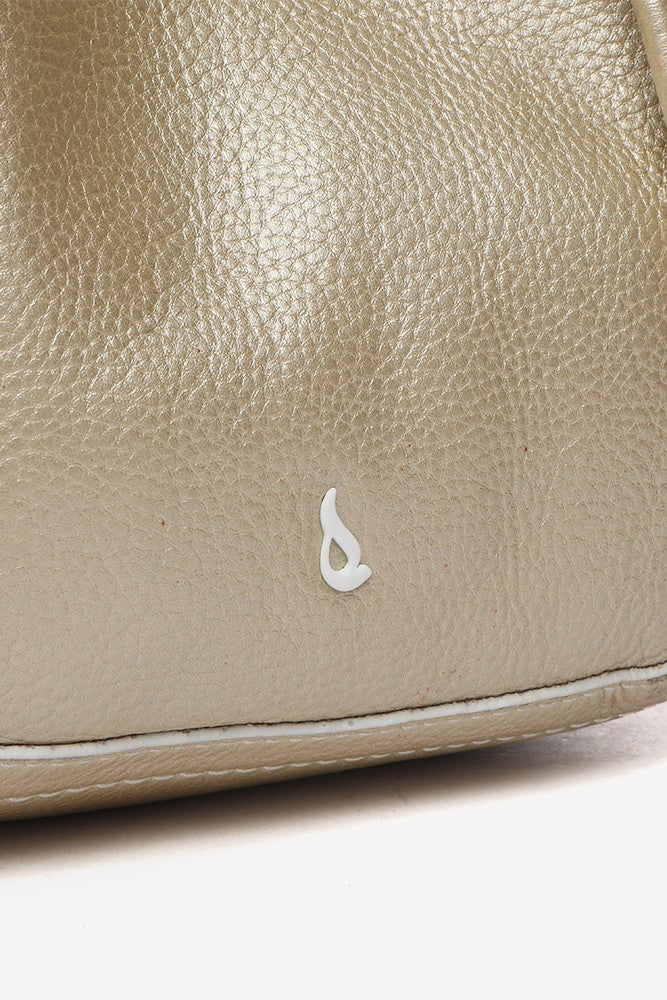 • Su exterior, se caracteriza por las costuras visibles, el cierre superior magnético y un pequeño aplique metálico con el logotipo de la marca.