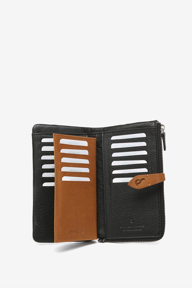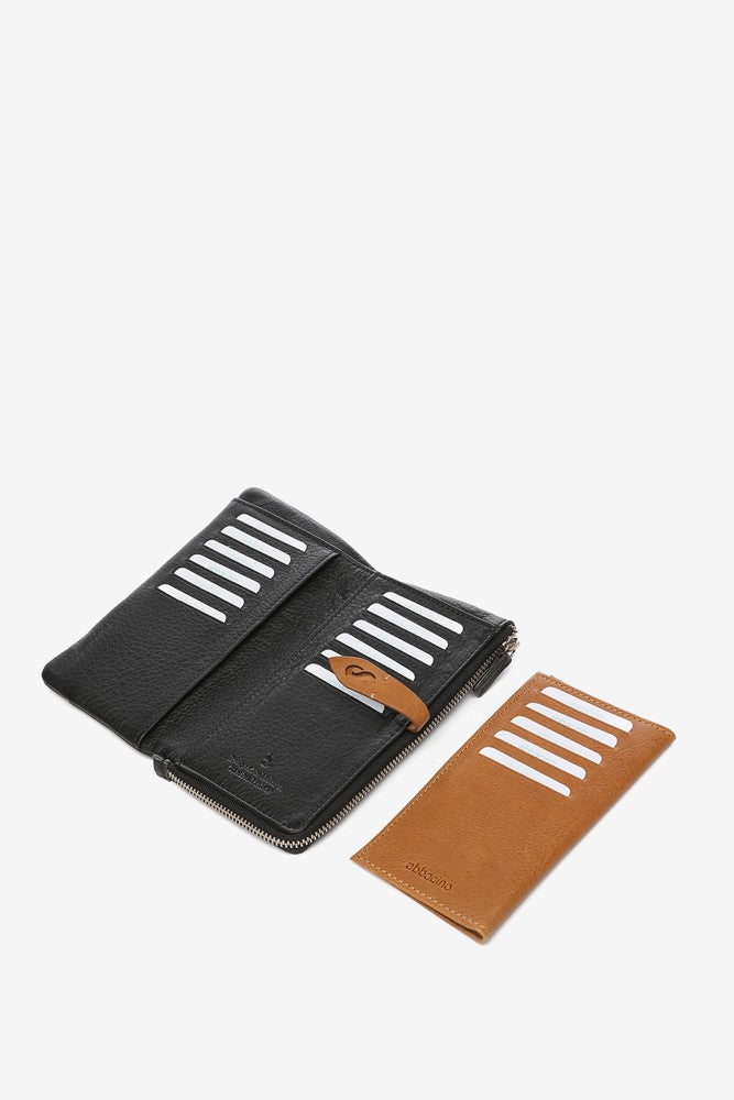 Cartera grande de mujer elaborada en piel Premium. Un diseño clásico y elegante en el que destacan detalles en color cuero. Combínala con tus maxi bolsos como shopper u hobos.