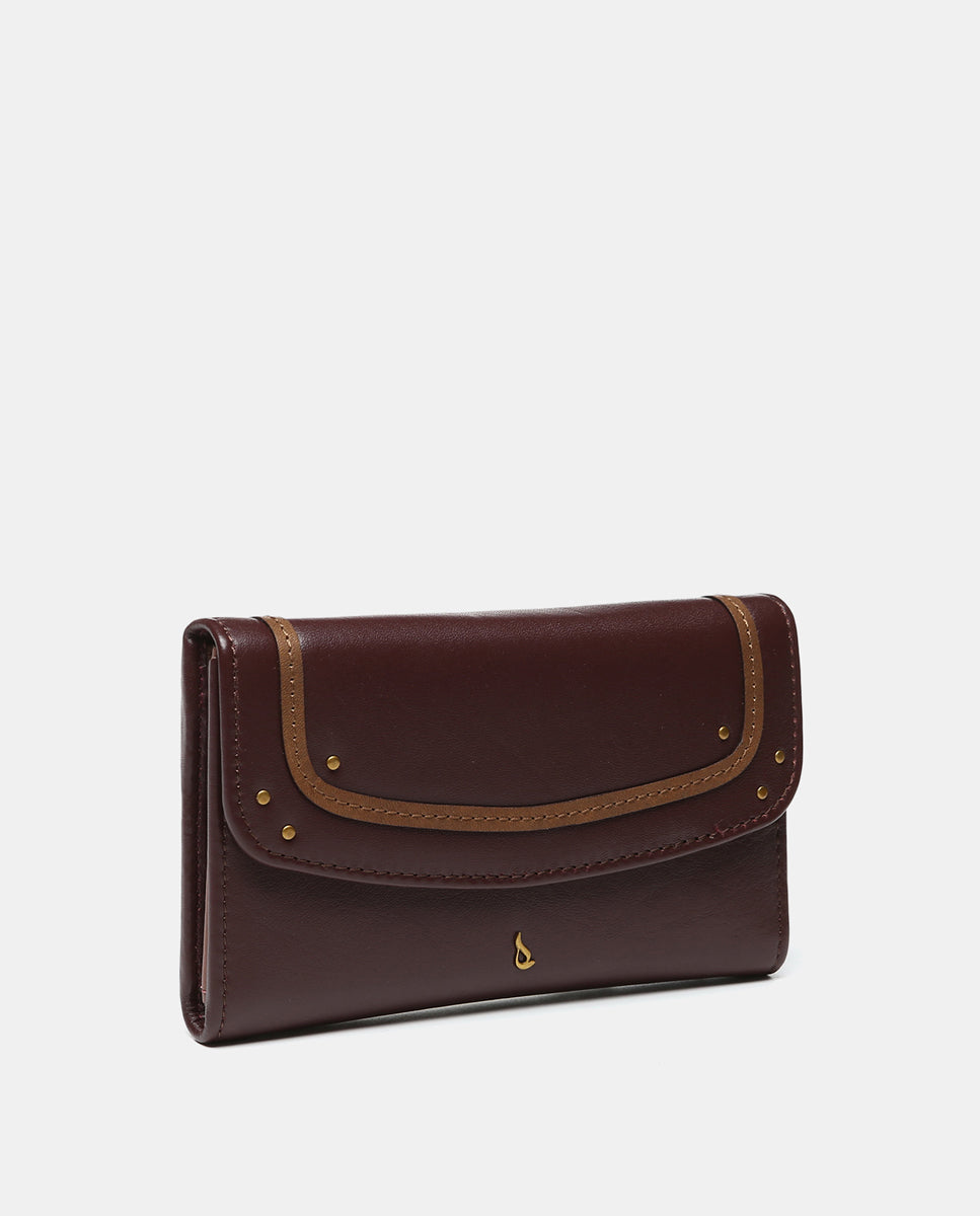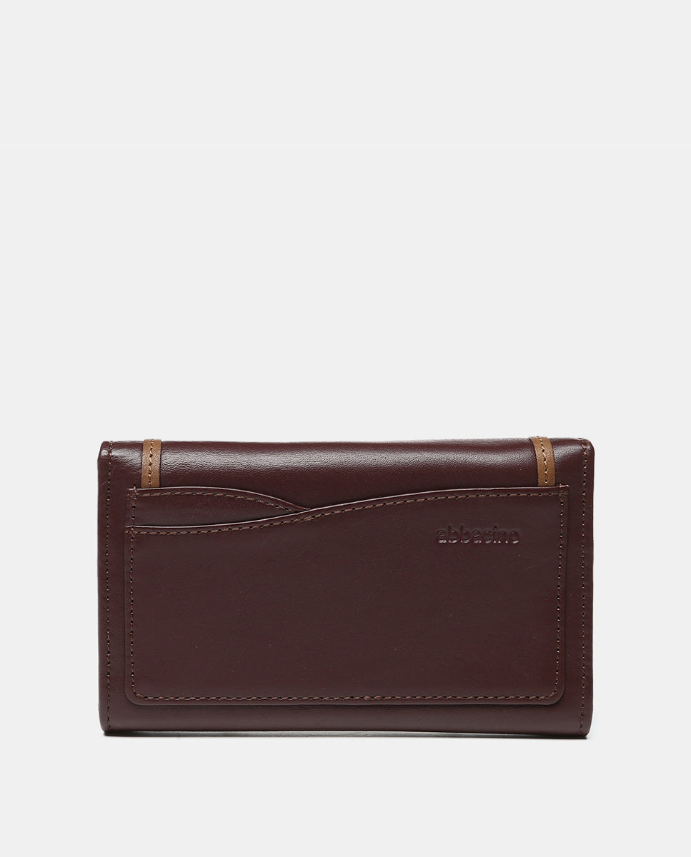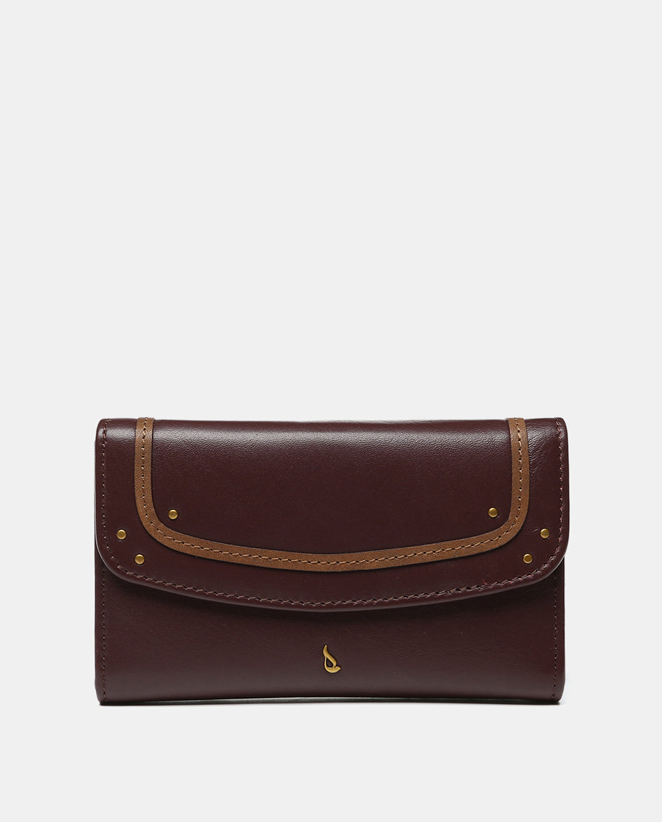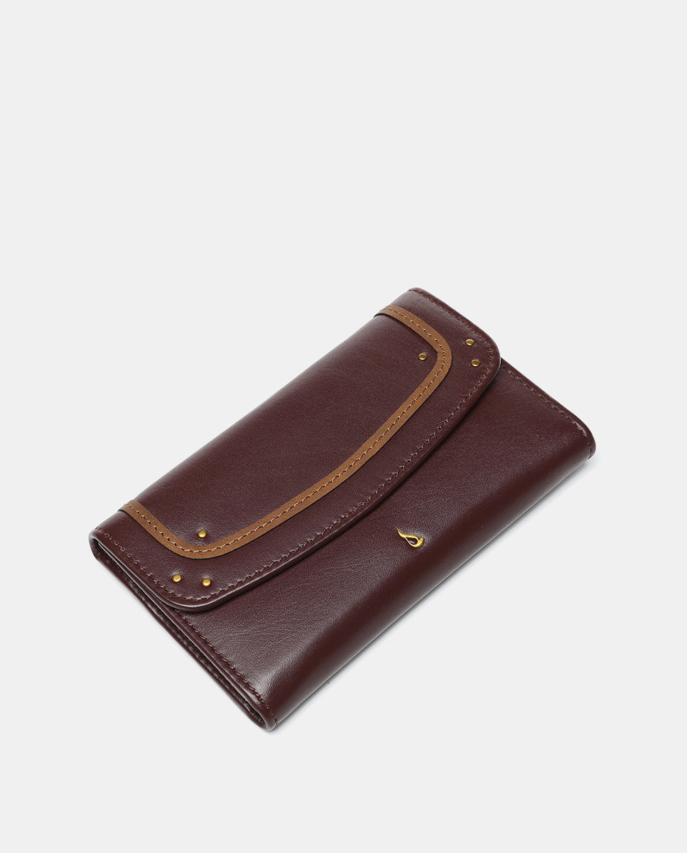 Cartera mediana de mujer en piel Premium, que se distingue por su cierre con solapa y una franja de color contrastante sobre ella. Elegante y funcional, perfecta para el día a día. Sus principales características son: