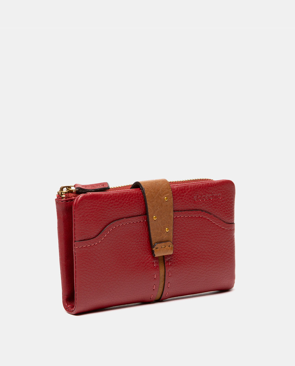 Cartera mediana de mujer elaborada en piel vacuna, que combina dos tonalidades y presenta remaches metálicos sobre su cierre. Elegante y funcional, ideal para el día a día. Sus principales características son: