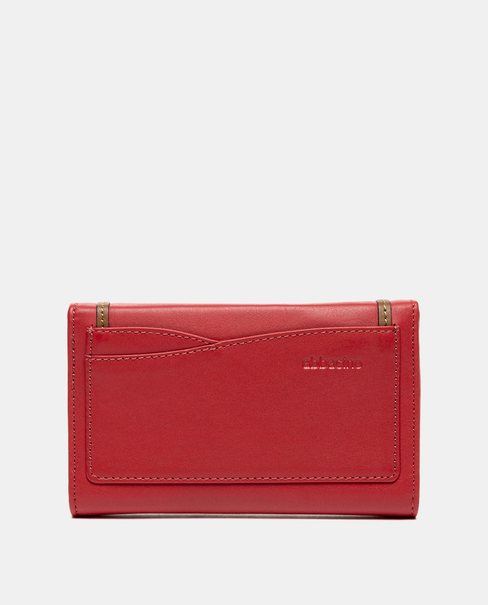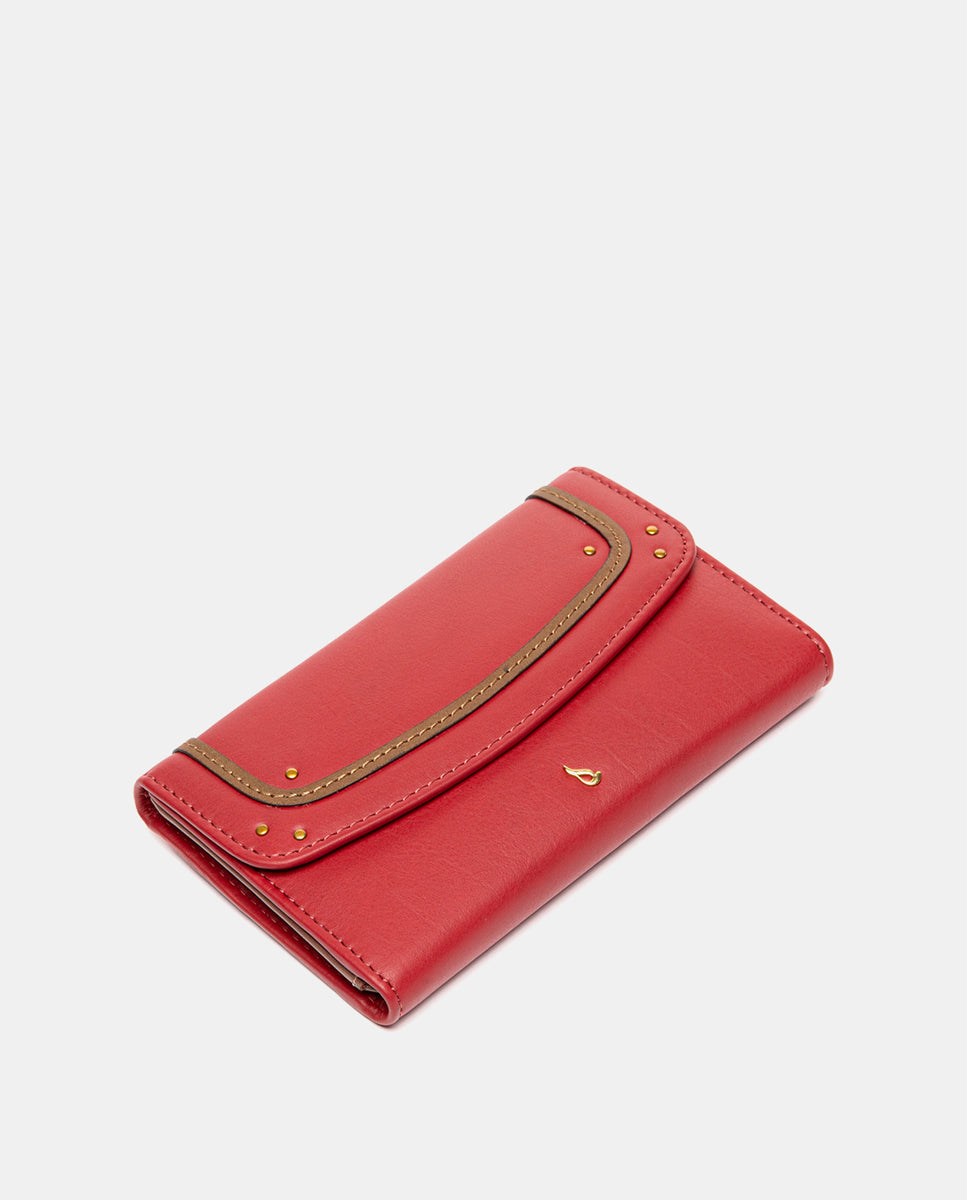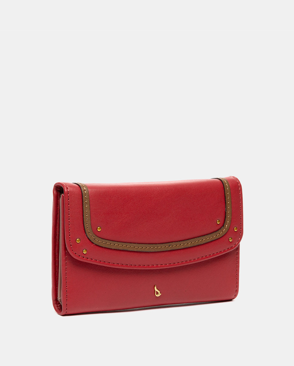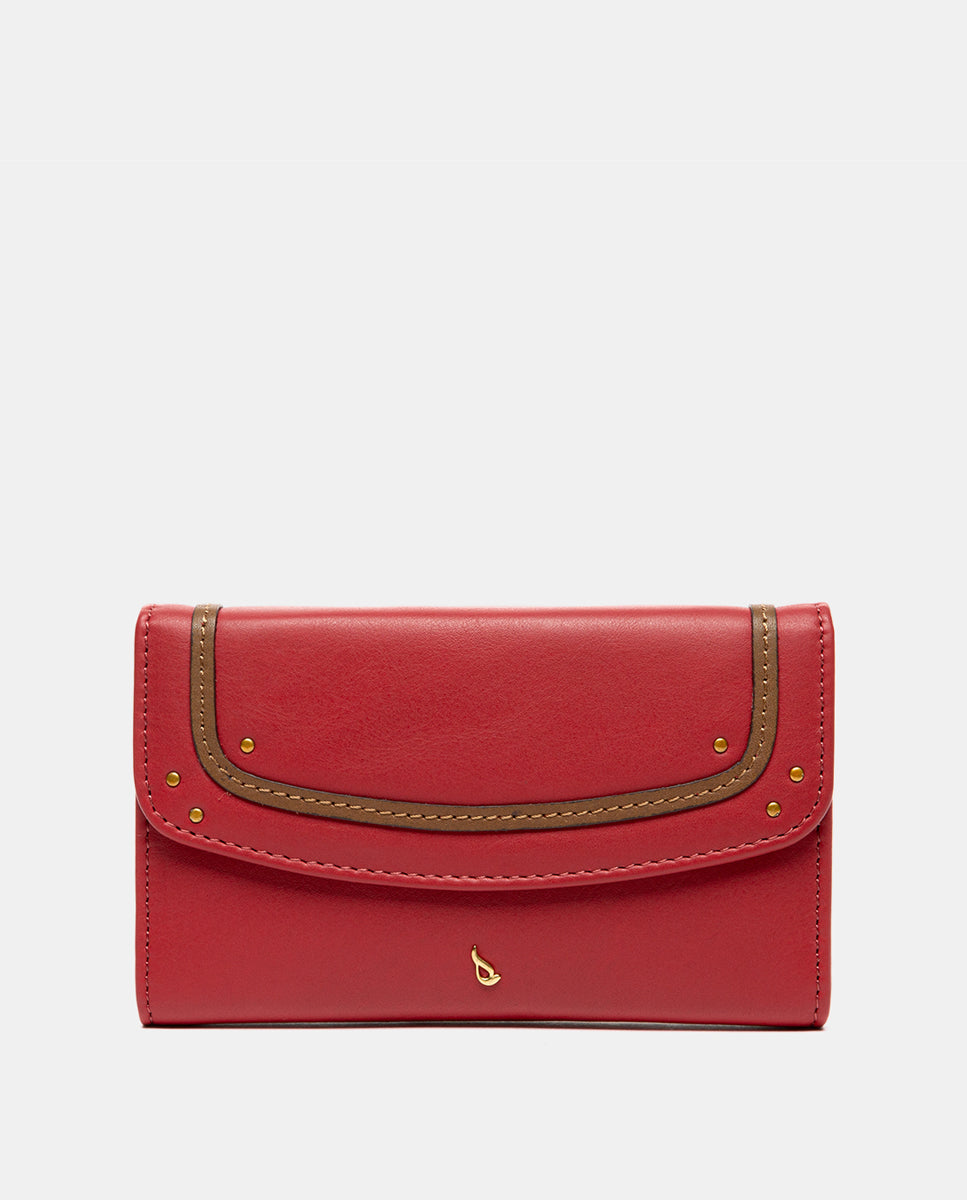 Cartera mediana de mujer en piel Premium, que se distingue por su cierre con solapa y una franja de color contrastante sobre ella. Elegante y funcional, perfecta para el día a día. Sus principales características son: