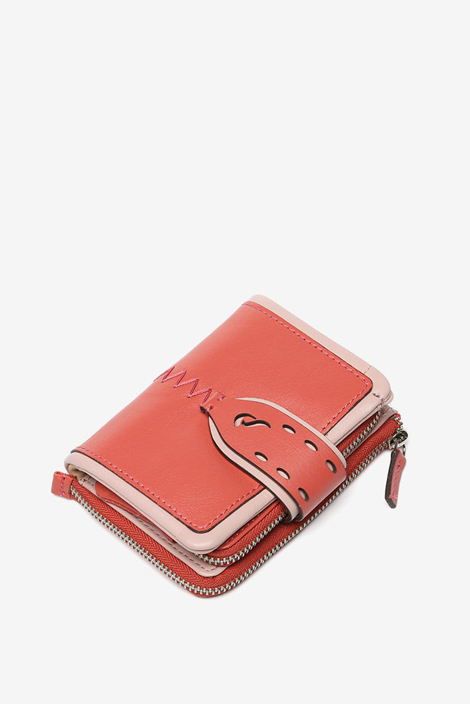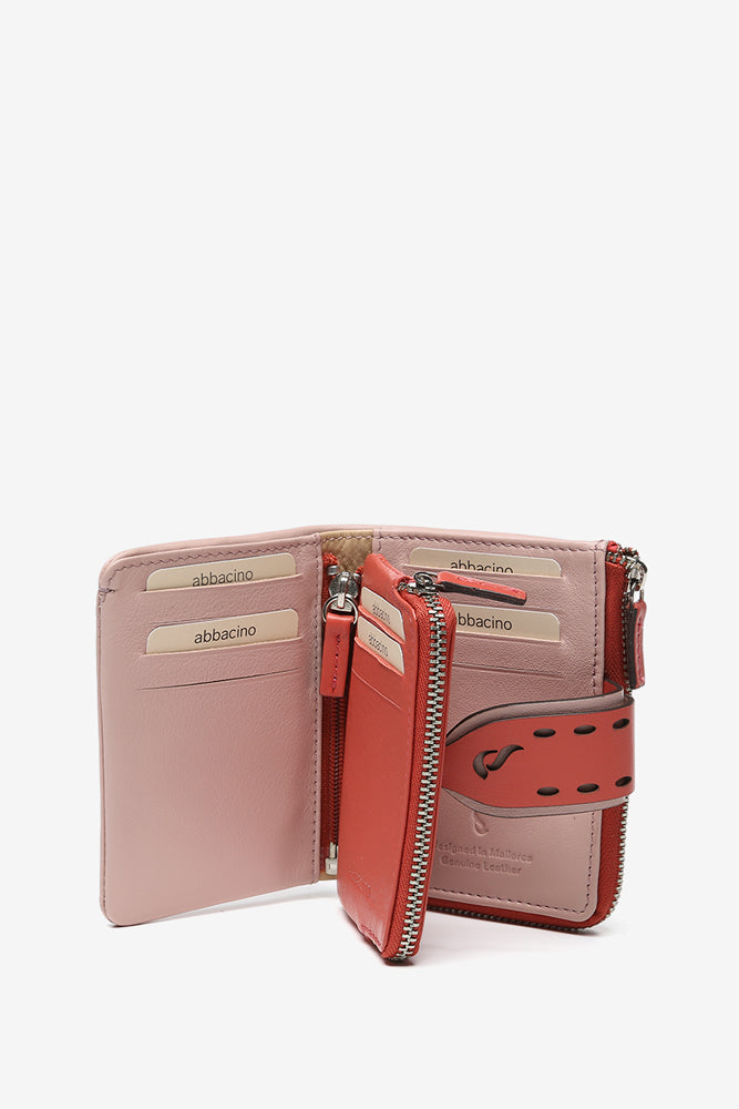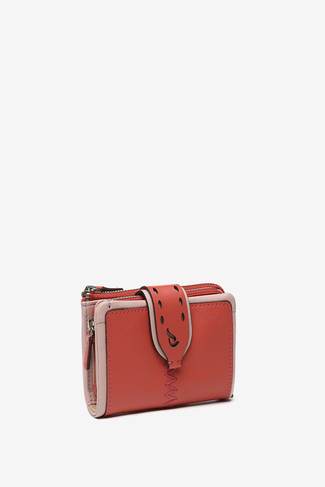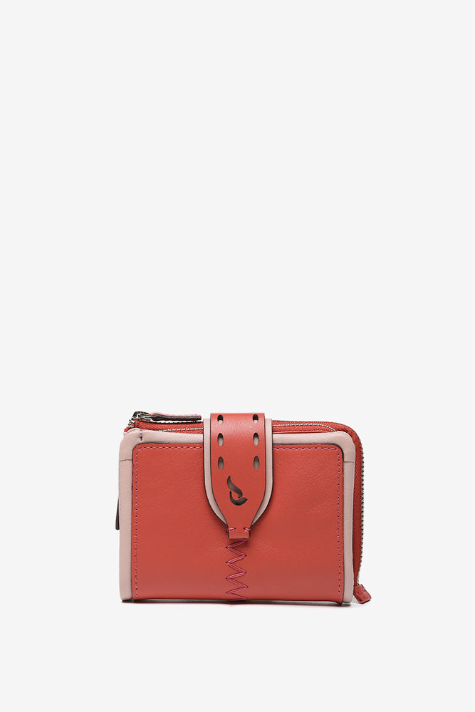 Cartera pequeña de mujer elaborada en piel Premium. Este modelo se caracteriza por su simplicidad con un toque distintivo: un detalle decorativo en la parte frontal que incluye una tira de piel troquelada en un tono más claro con el logo de la firma. Sus principales características son: