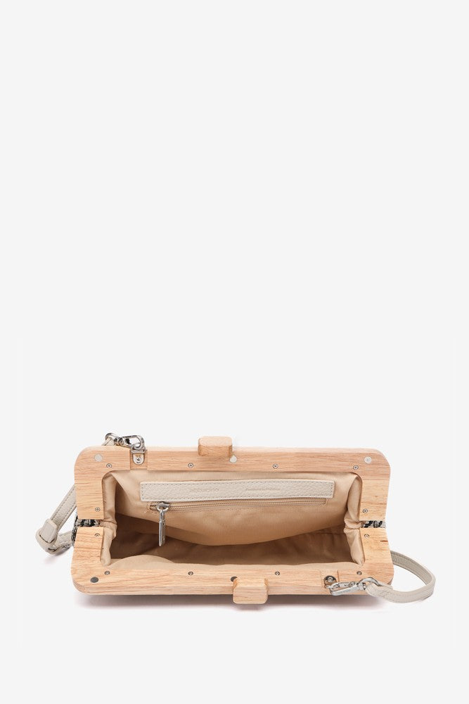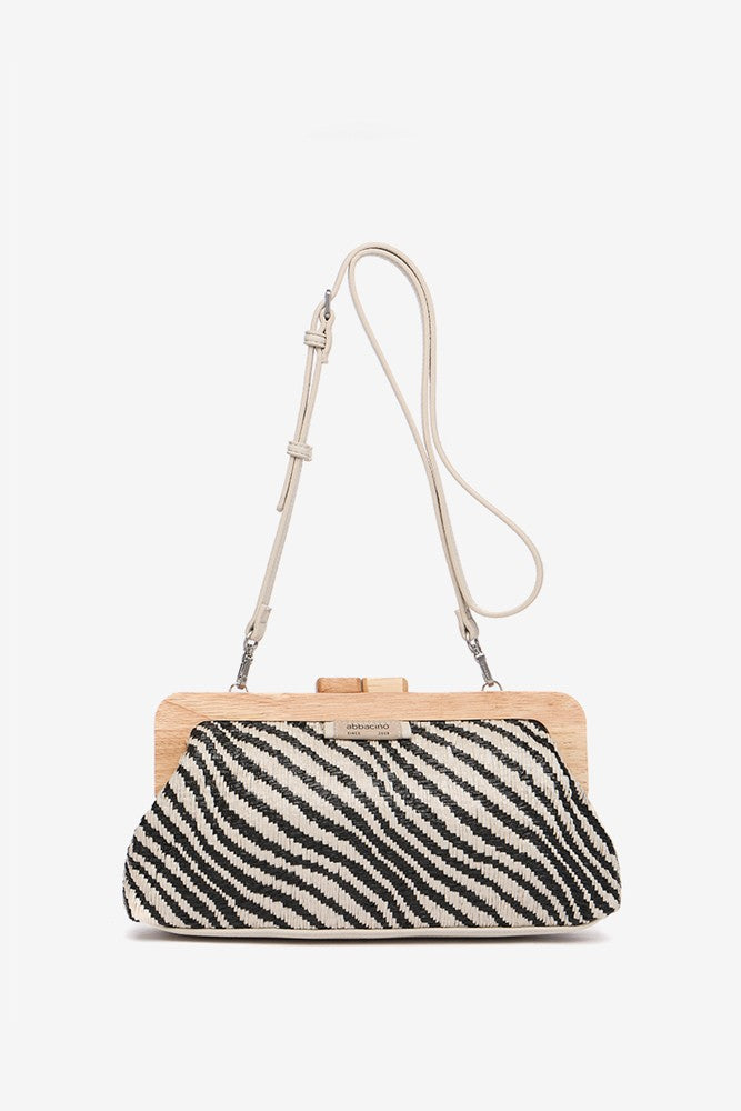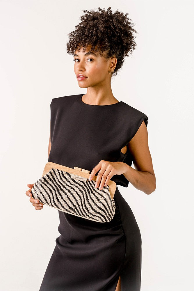 Bolso clutch realizado en una bonita combinación trenzada y madera. Este modelo con estampado animal print destaca por su elegancia y su estilo sofisticado, ideal para acompañarte en eventos especiales. Sus principales características son: