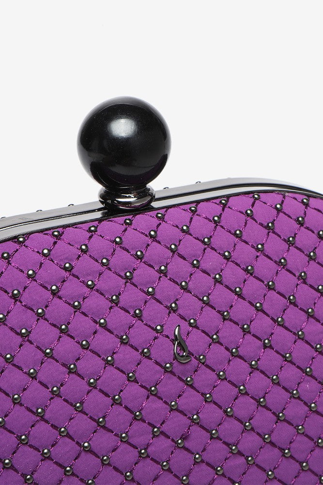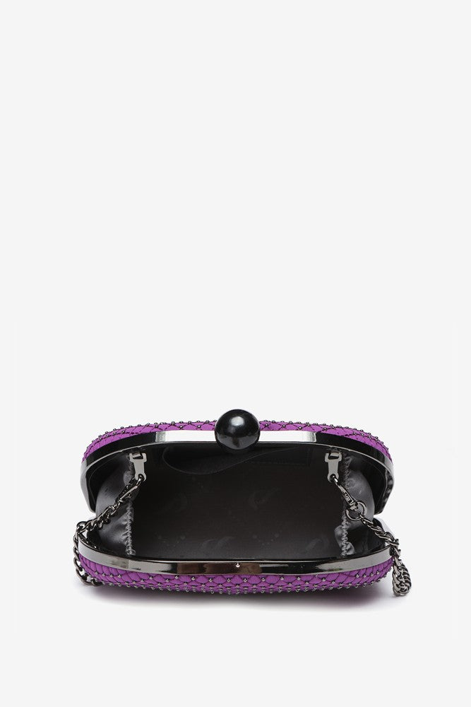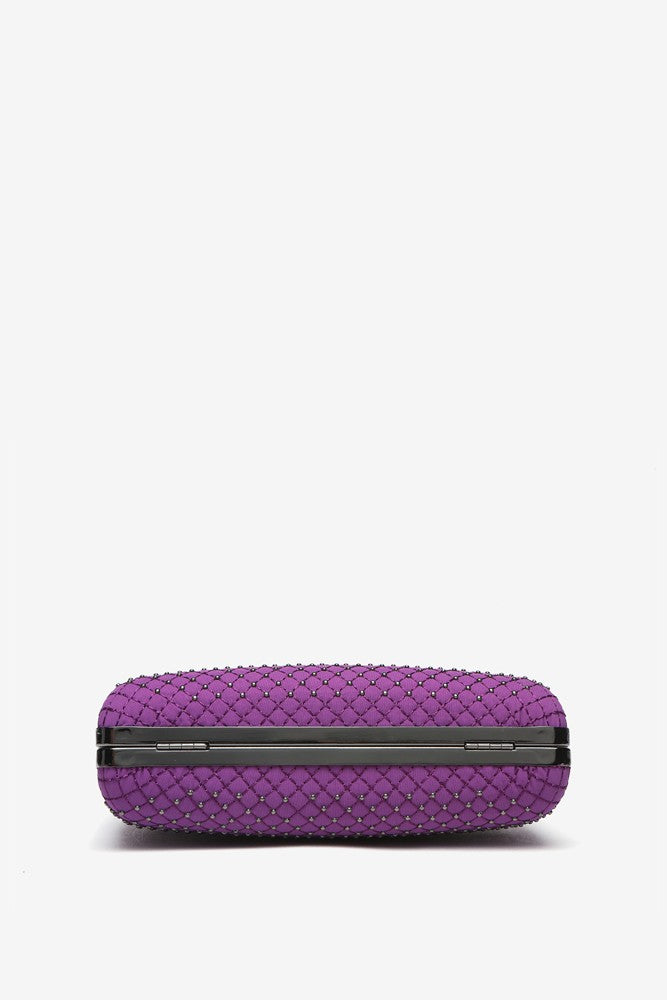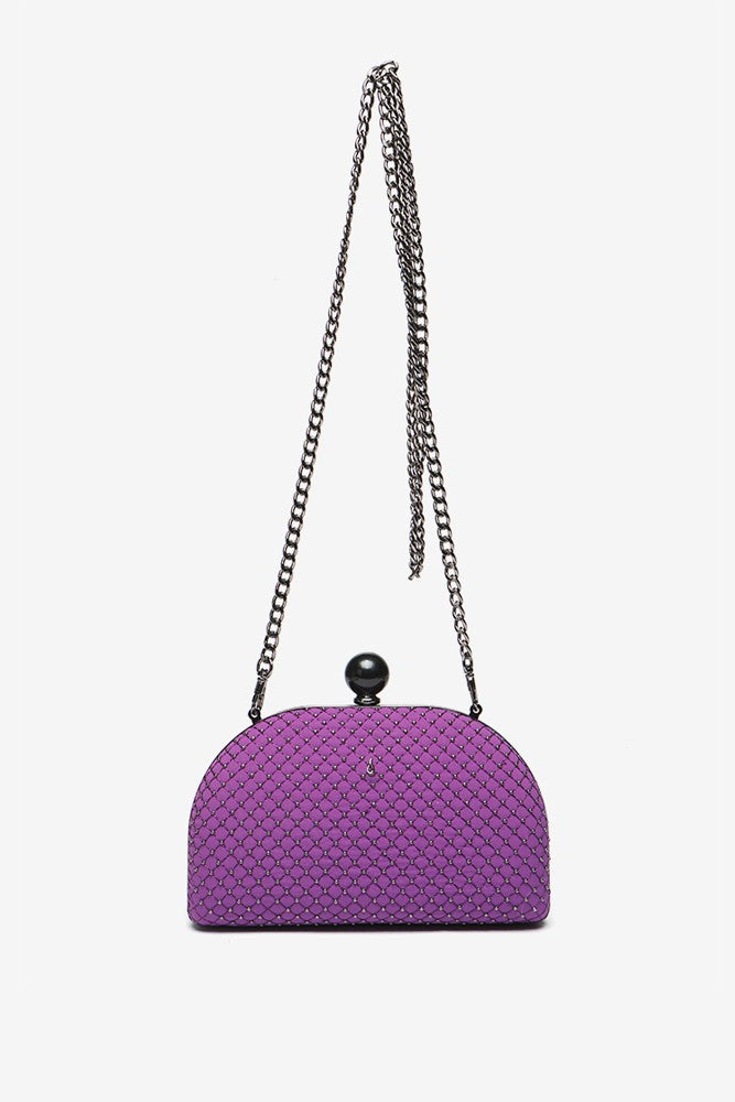 Bolso de mano estilo clutch con silueta de media luna para ocasiones especiales. Un complemento de fiesta ideal para acompañarte en eventos o para dar un aire sofisticado y elegante a tus looks. De textura rígida, cuenta con un original cierre de boquilla, y viene teñido por colores originales y pequeños apliques metalizados.