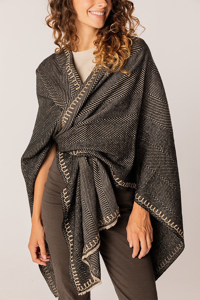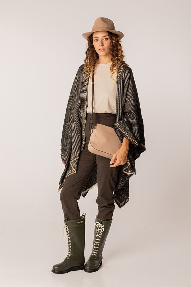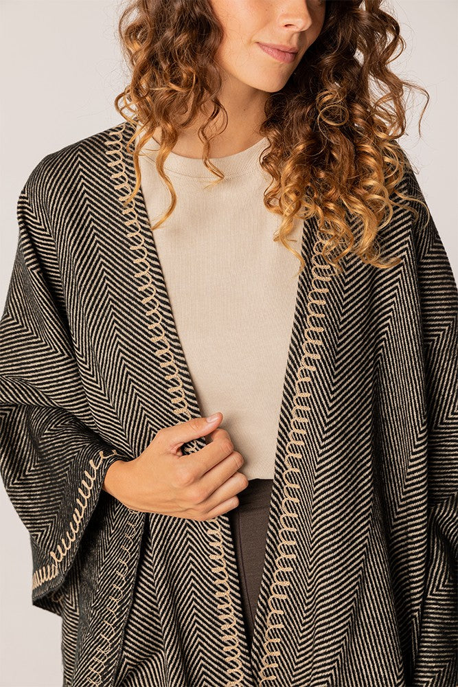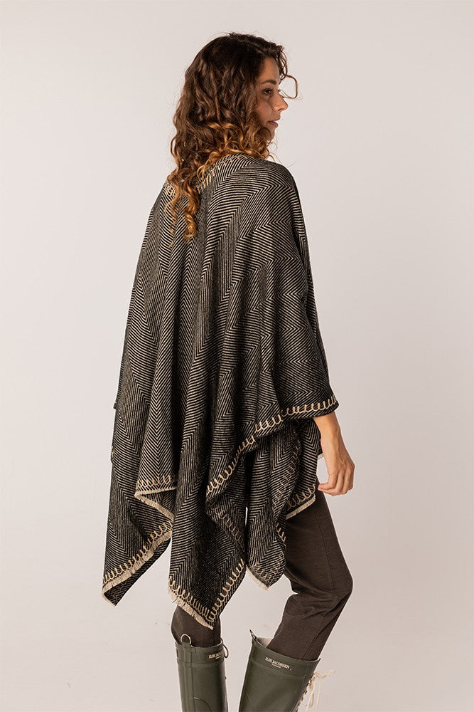 Poncho de mujer muy calentito, holgado y suave al tacto, perfecto para acompañarnos en los días de otoño e invierno. Un diseño muy combinable gracias a su tono oscuro, sobre el que destacan los ribetes y los flecos inferiores a contraste en beige. Perfecto para tus looks diarios.