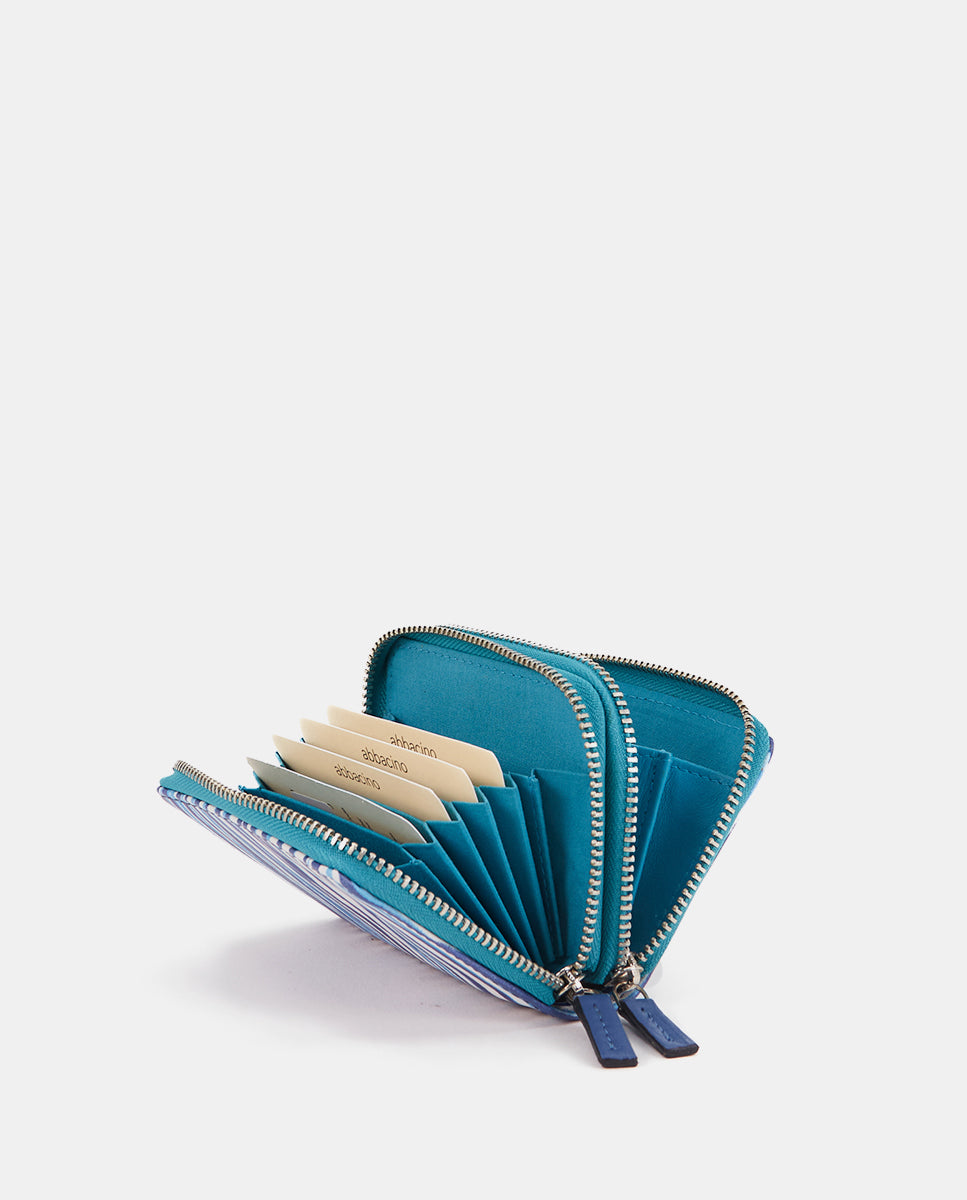 Cartera pequeña de mujer en formato acordeón elaborada con piel. Un diseño con un bonito estampado a rayas, en tonos frescos y vivos. Se trata de un complemento que cuida hasta el mínimo detalle y que gracias a su distribución nos permite conseguir un orden excelente. Sus principales características son: