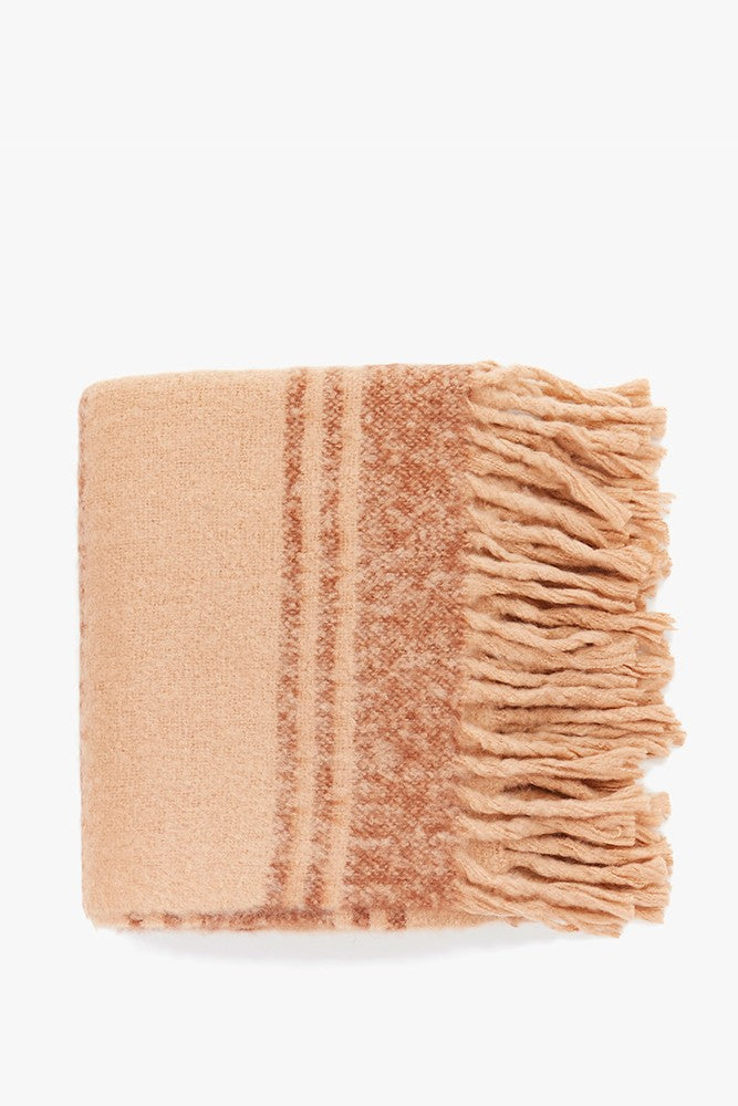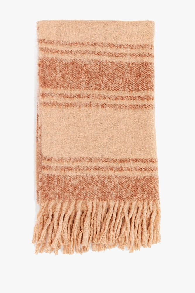 Maxi bufanda de mujer, perfecta para los días más fríos. Muy suave y agradable al tacto, se completa con flecos en sus extremos. Una apuesta en tonos frescos, con un sutil estampado lineal, ideal para aportar luz a tus looks invernales.