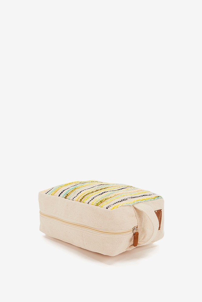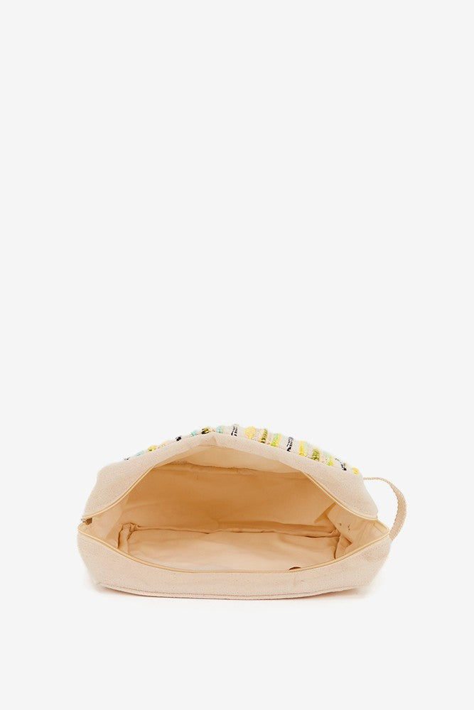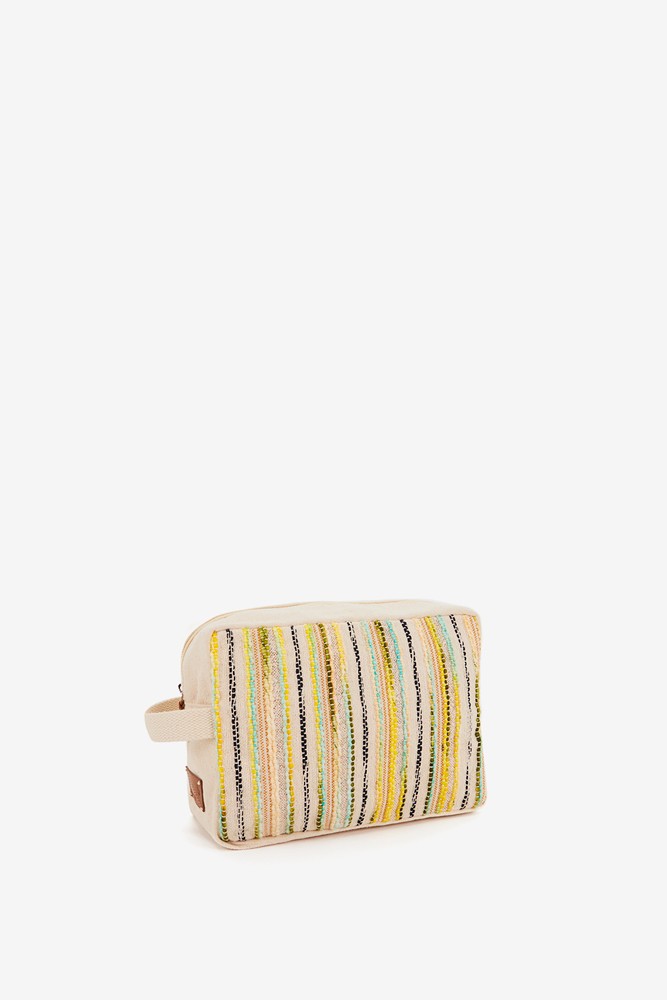 Neceser de mujer elaborado con algodón. Un diseño de tejido holgado perfecto para llevar contigo el teléfono móvil, llaves, bronceador... Ideal para los días de playa gracias a su print lineal y sus tonos estivales. Cierre con cremallera superior.