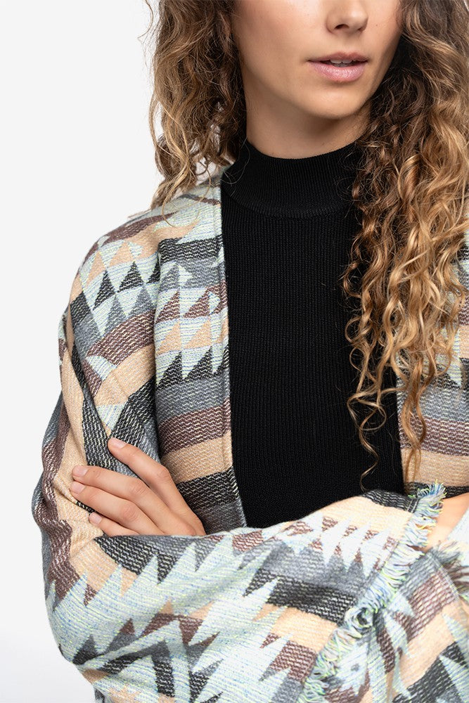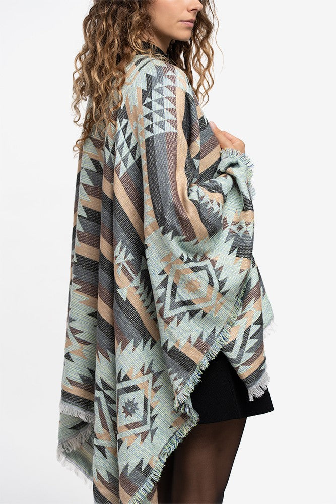 Poncho de mujer con estampado geométrico de estilo étnico que combina diferentes tonalidades de color. Su tejido, goza de un tacto ultra suave y es muy calentito, perfecto para los días de otoño e invierno. Sus extremos deshilados, le aportan un aire muy casual. Muy combinable y a la moda, se convertirá en un imprescindible para los días de frío.