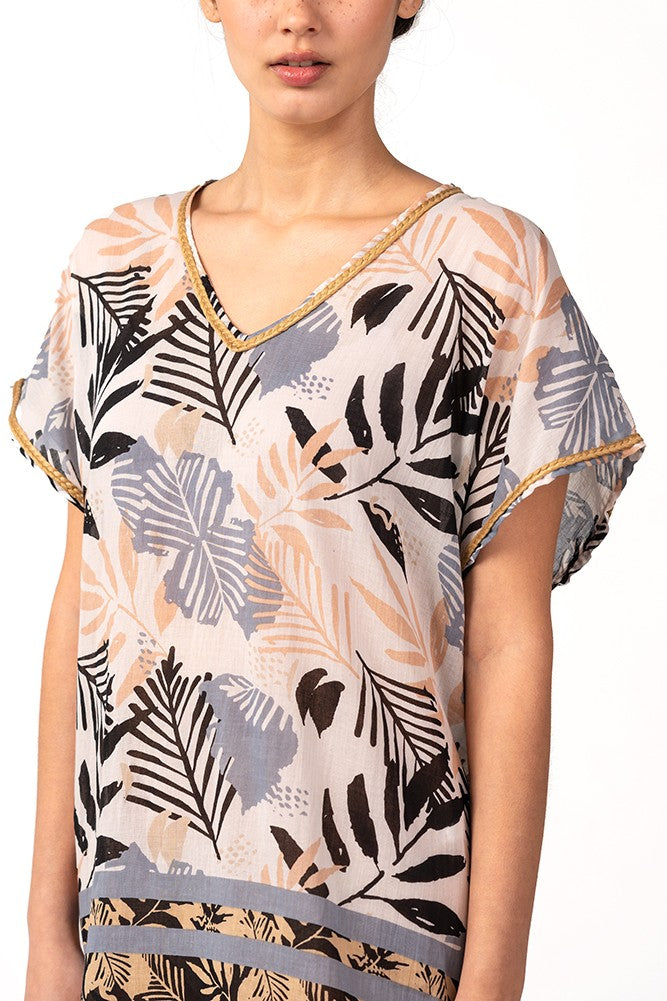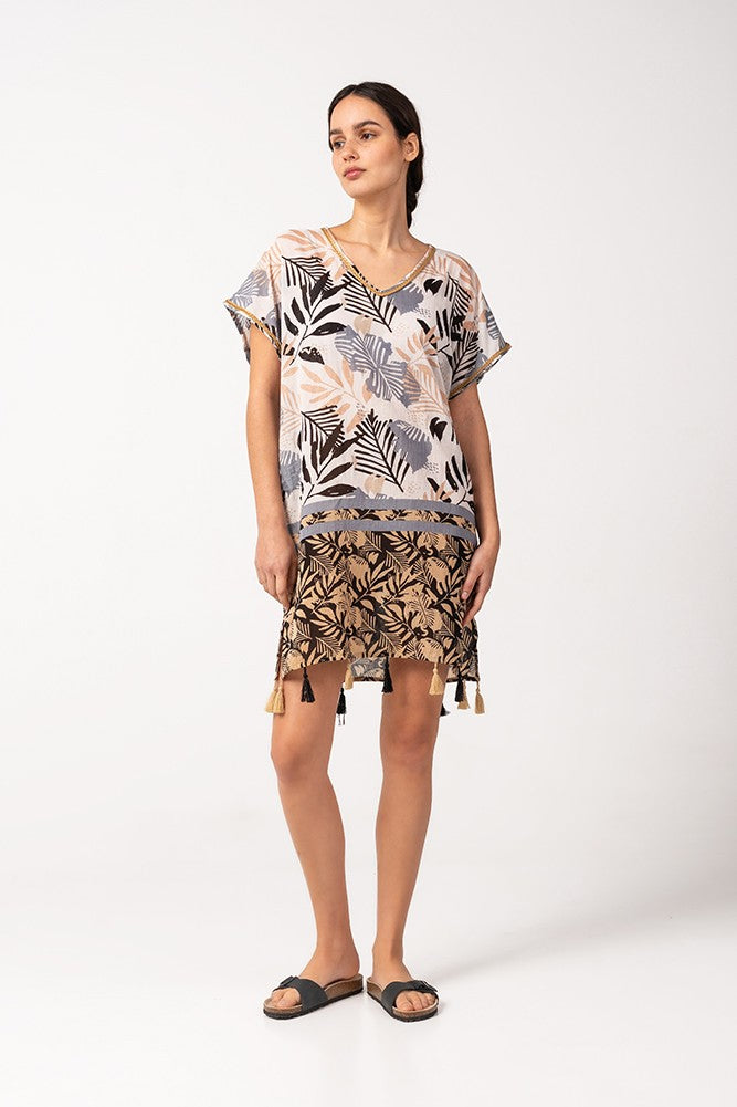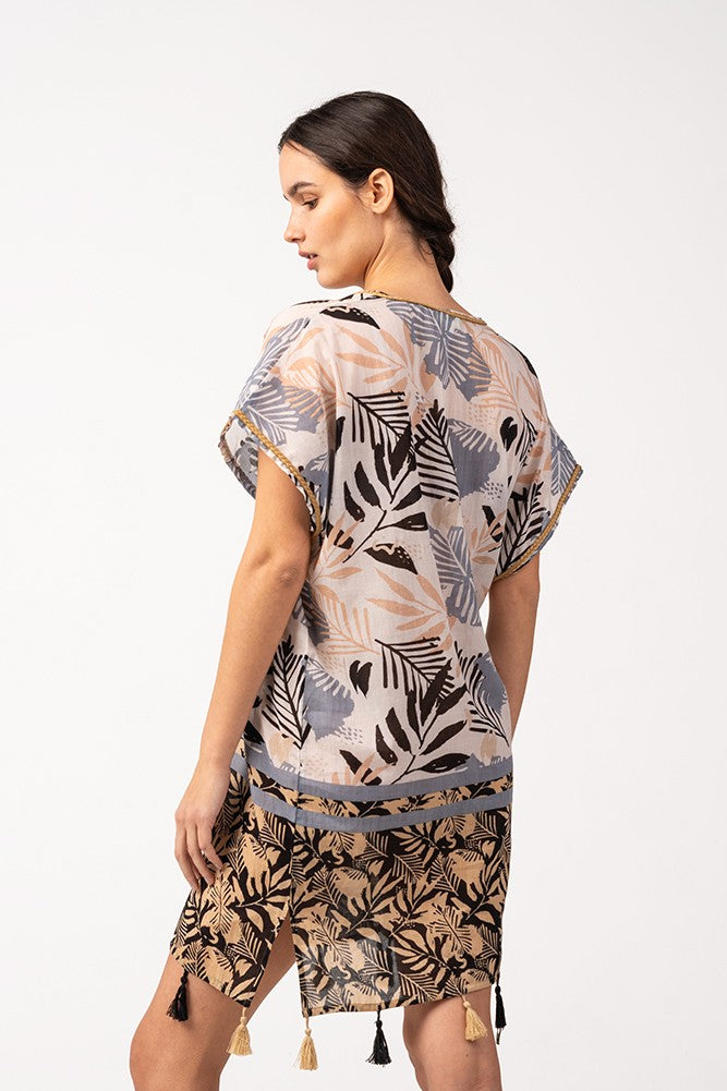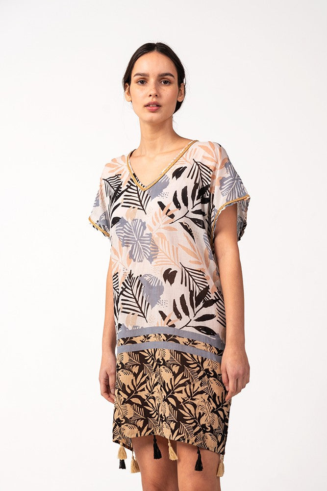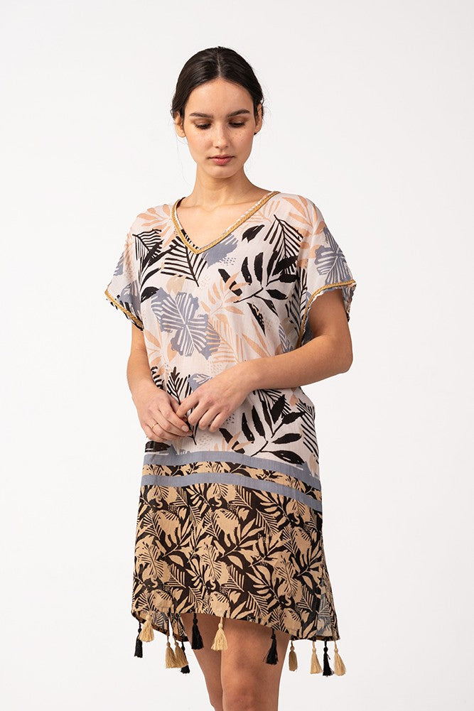 Caftán de mujer elaborado en algodón con un elegante estampado tropical, ideal para los días de playa y piscina. Su tejido es muy holgado y suave al tacto, por lo que es un complemento perfecto para acompañarnos durante los días más calurosos del año. Dispone de un escote pico muy favorecedor y borlas en los bajos.