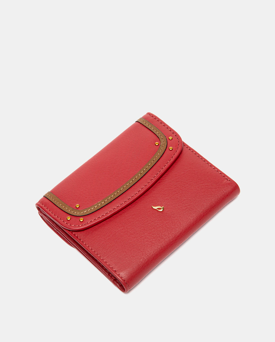 Tarjetero de mujer en piel Premium, que destaca por su cierre con solapa y una franja de color contrastante sobre ella. Compacto y práctico, ideal para llevar lo esencial de manera organizada. Sus principales características son: