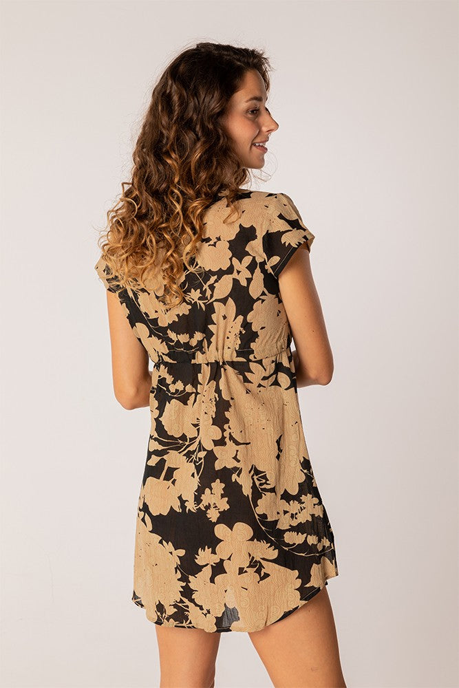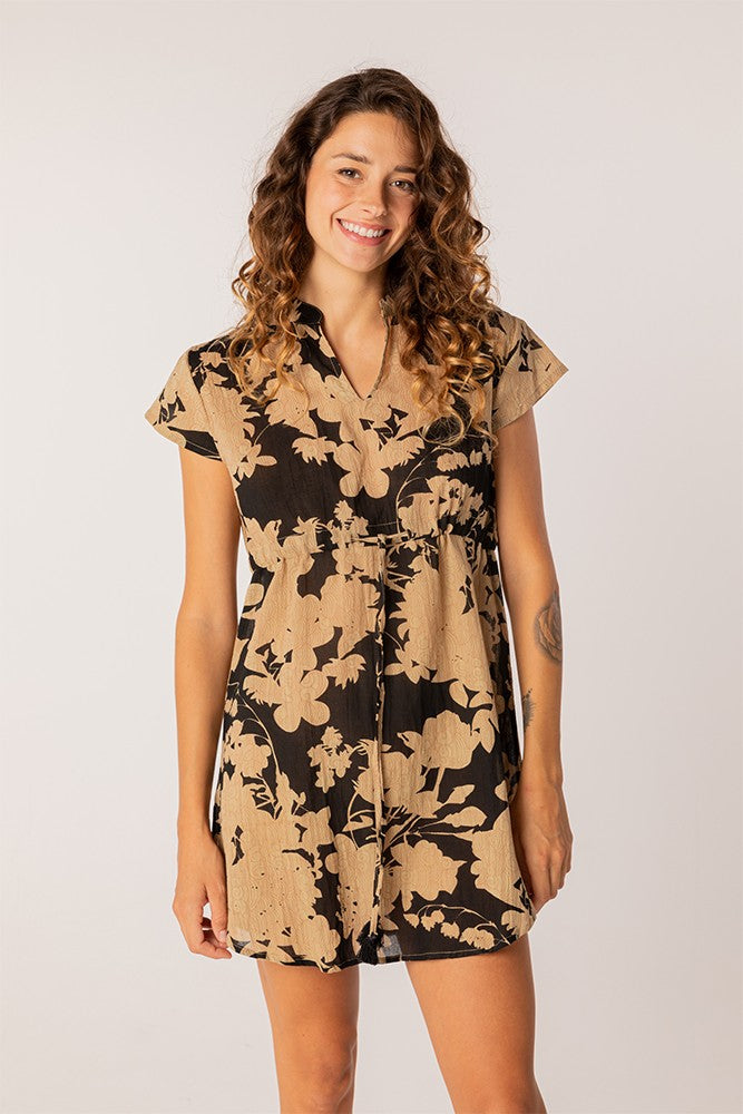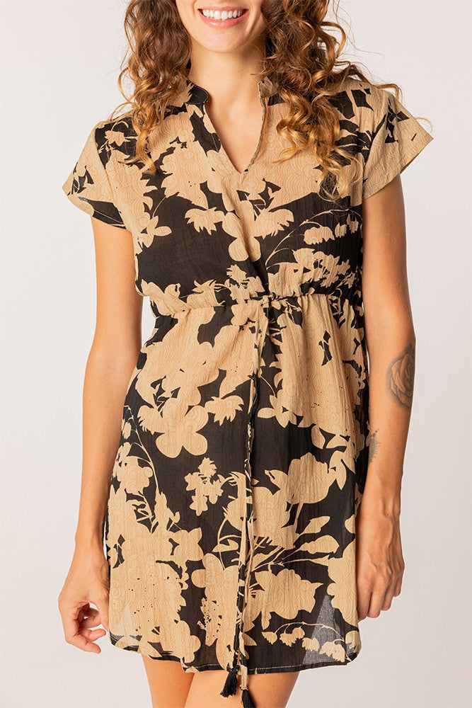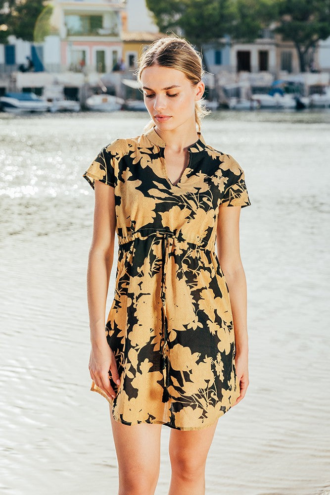 Vestido de playa de mujer elaborado en algodón con un bonito estampado floral que combina dos tonos de color. Su tejido es muy holgado y suave al tacto, por lo que es un complemento perfecto para acompañarnos durante los días de playa. Dispone de un escote pico muy favorecedor y cuenta con un cordón en la cintura que permite ajustarlo y ceñirlo al cuerpo.
